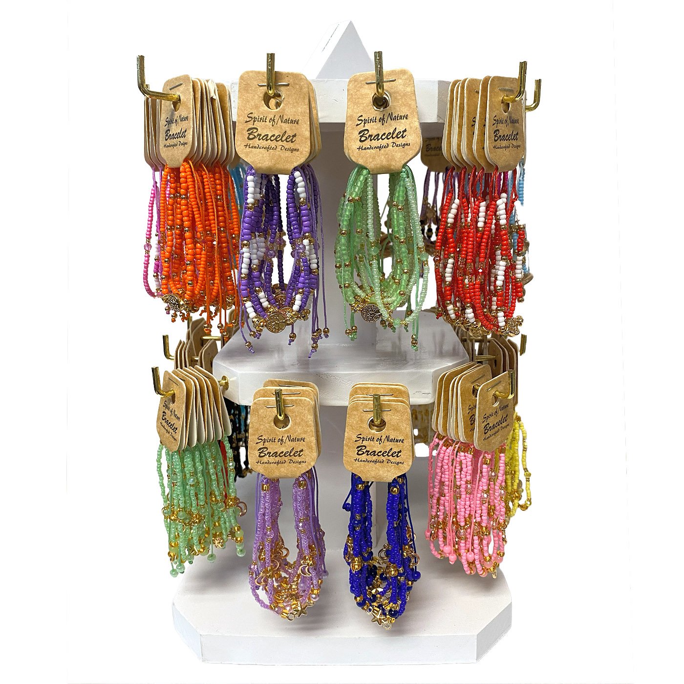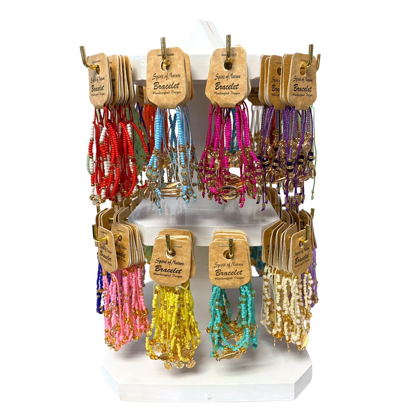 2-Tier spinning wooden display for 144 carded bracelets. Display comes with an assortment of beaded gold-colored metal charm bracelets with gold beads.