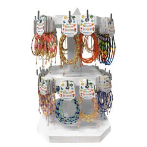 2-Tier spinning wooden display for 144 kid’s carded bracelets. Display comes with seed bead single strand pull tie bracelets in assorted colors.