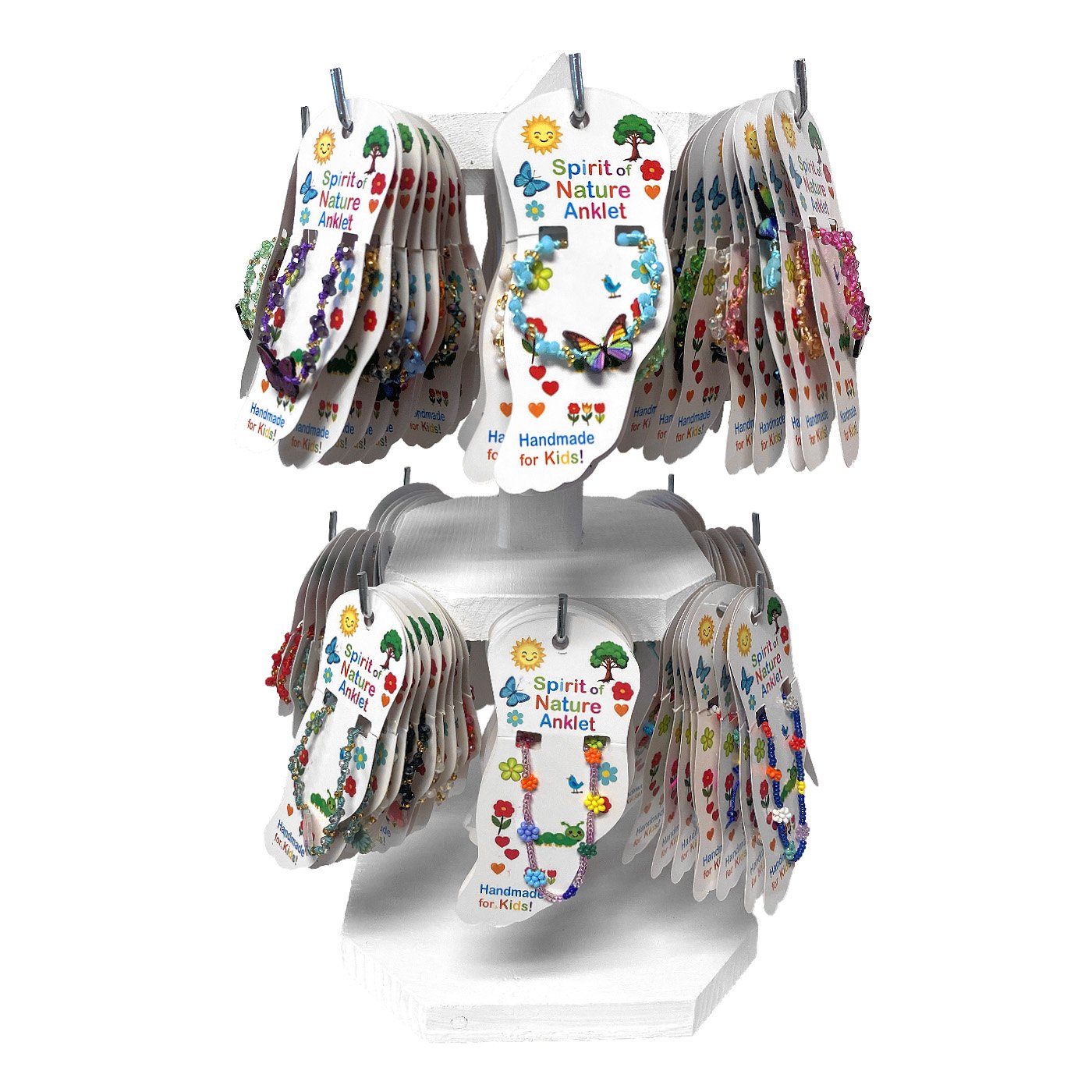 Add a bright and playful anklet display to your retail space with this 144-piece assortment of kids beaded pull tie anklets. Featuring fun, colorful designs including seed bead flowers, acrylic butterflies, and acrylic flower accents, this display creates an eye-catching presentation that appeals to younger customers.