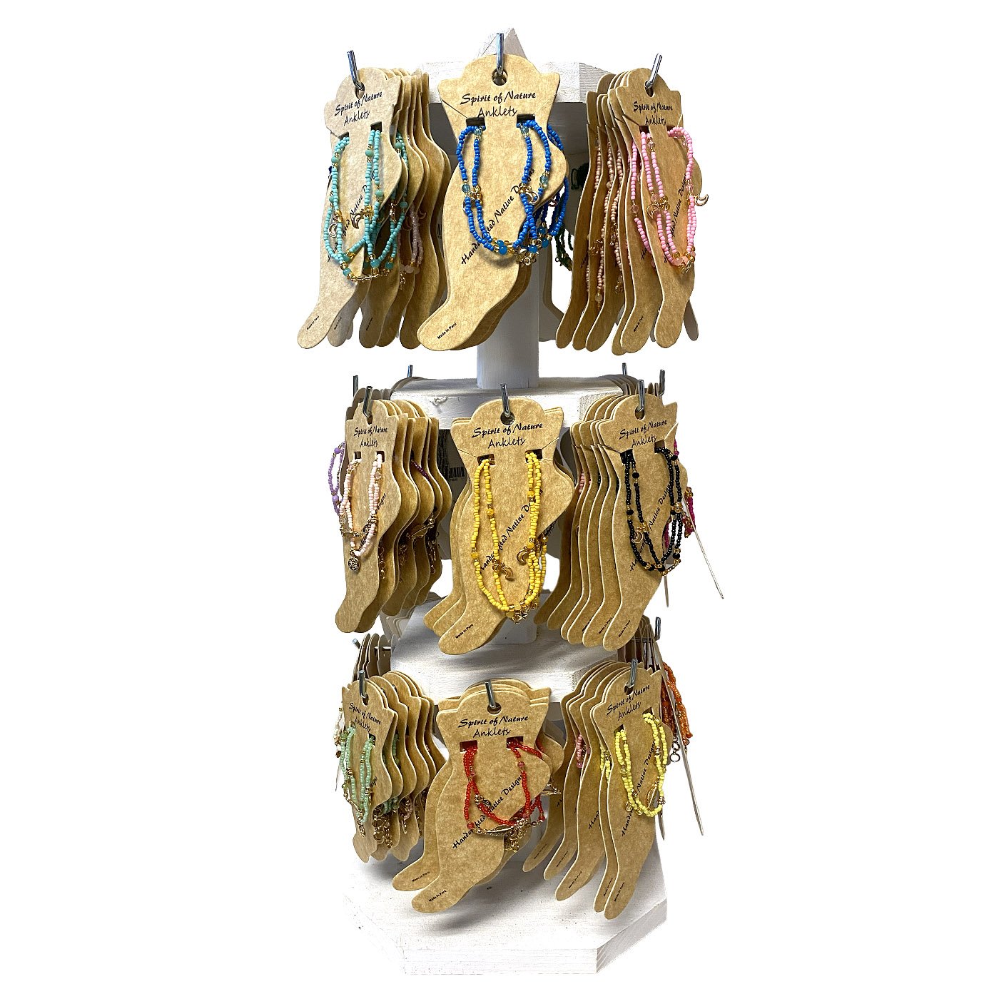 3-Tier spinning wooden display for 144 carded pull tie anklets. Anklet styles include an assortment of gold beaded multi strand anklets.