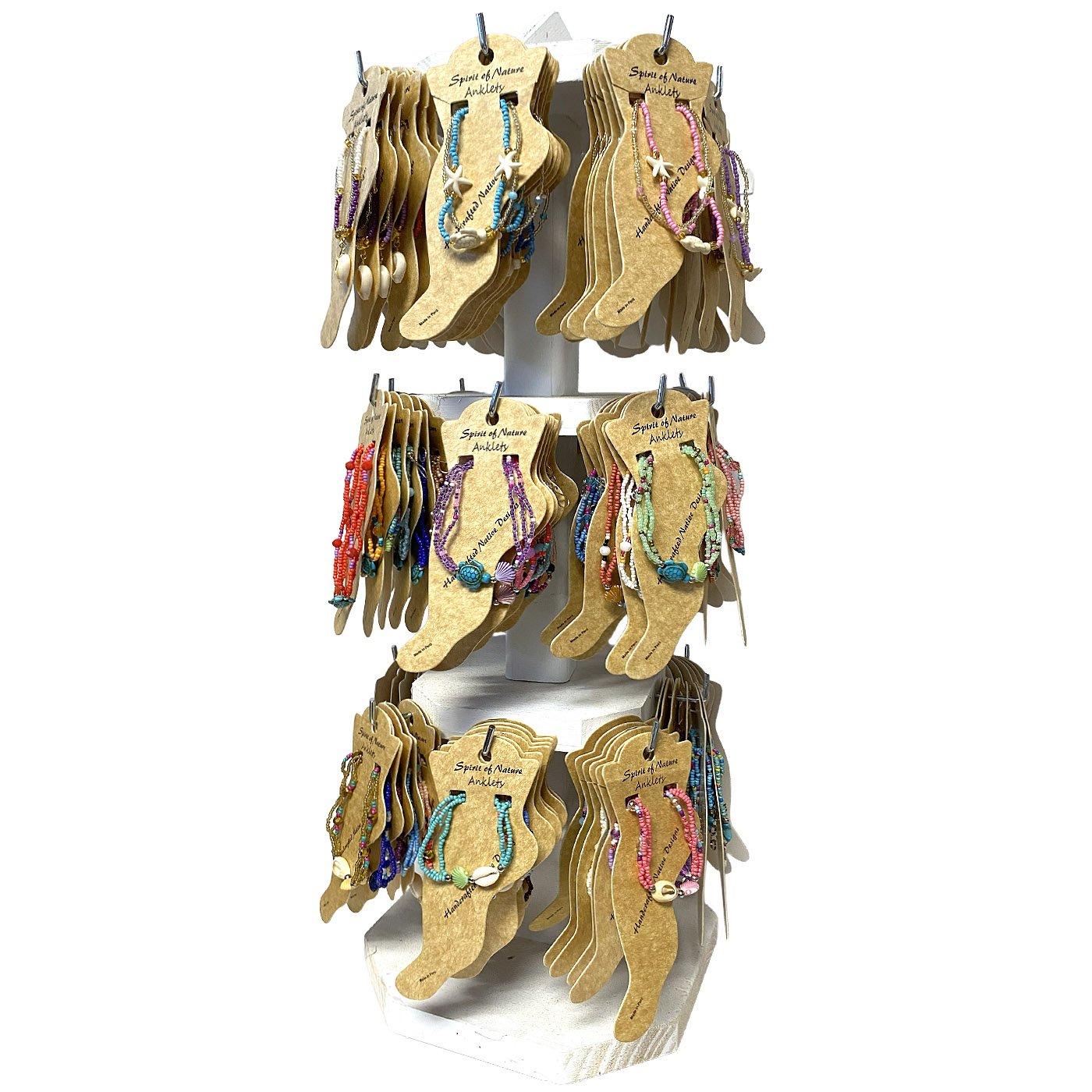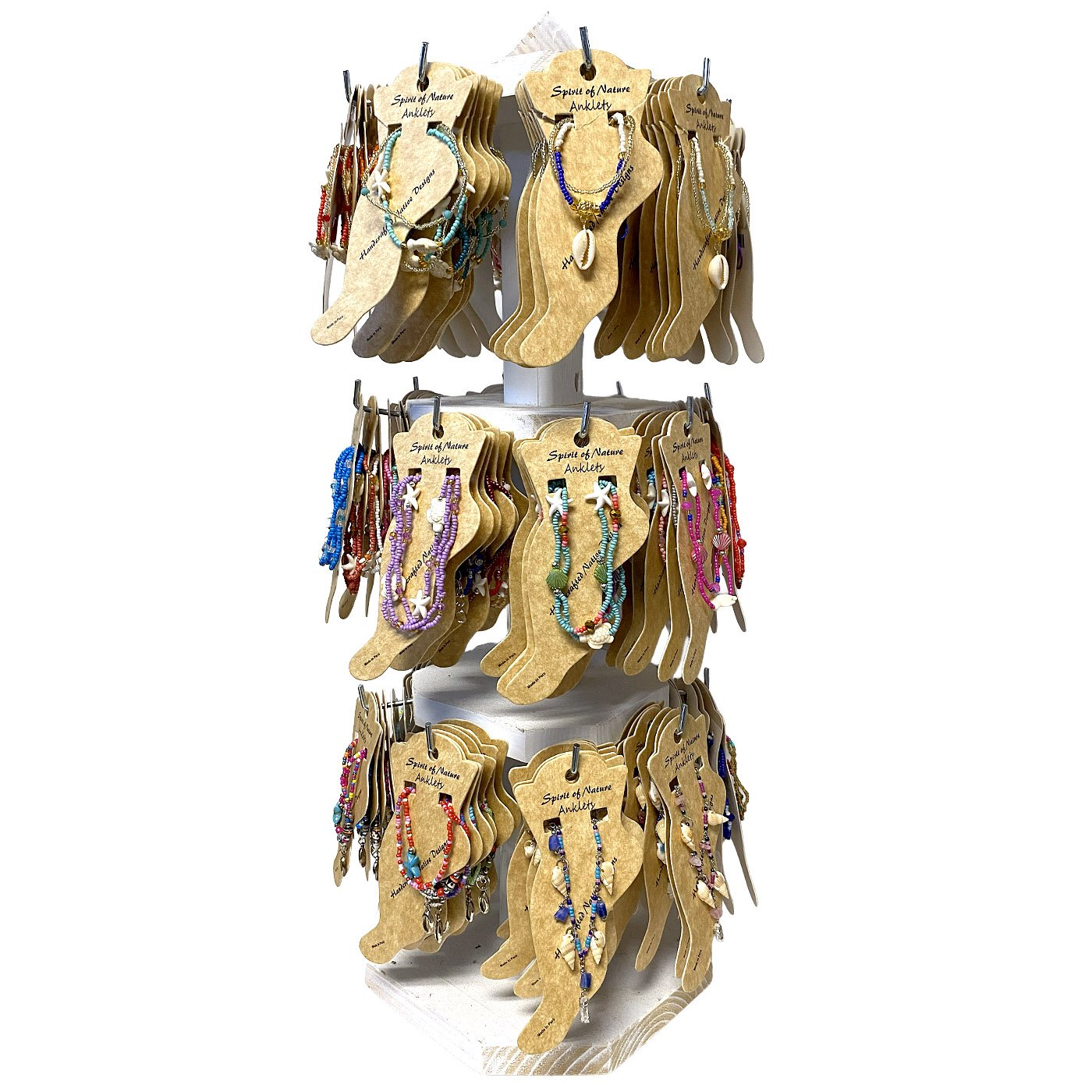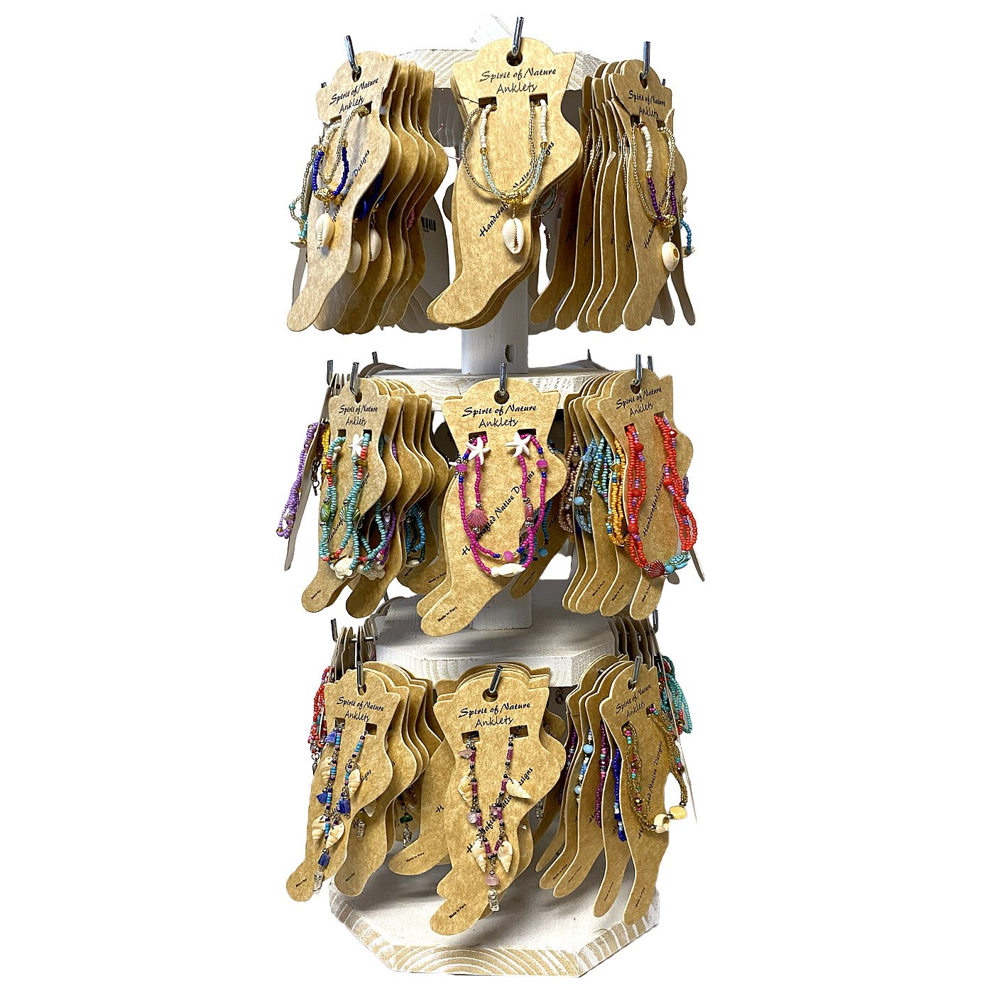 3-Tier spinning wooden display for 144 carded pull tie anklets. Anklet styles include an assortment of sea life themed anklets.