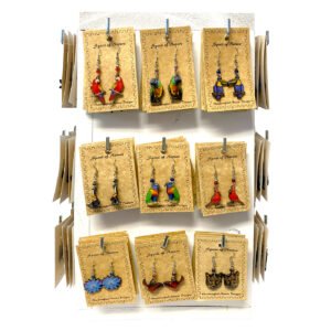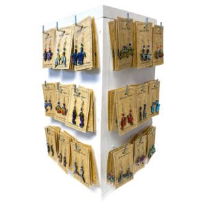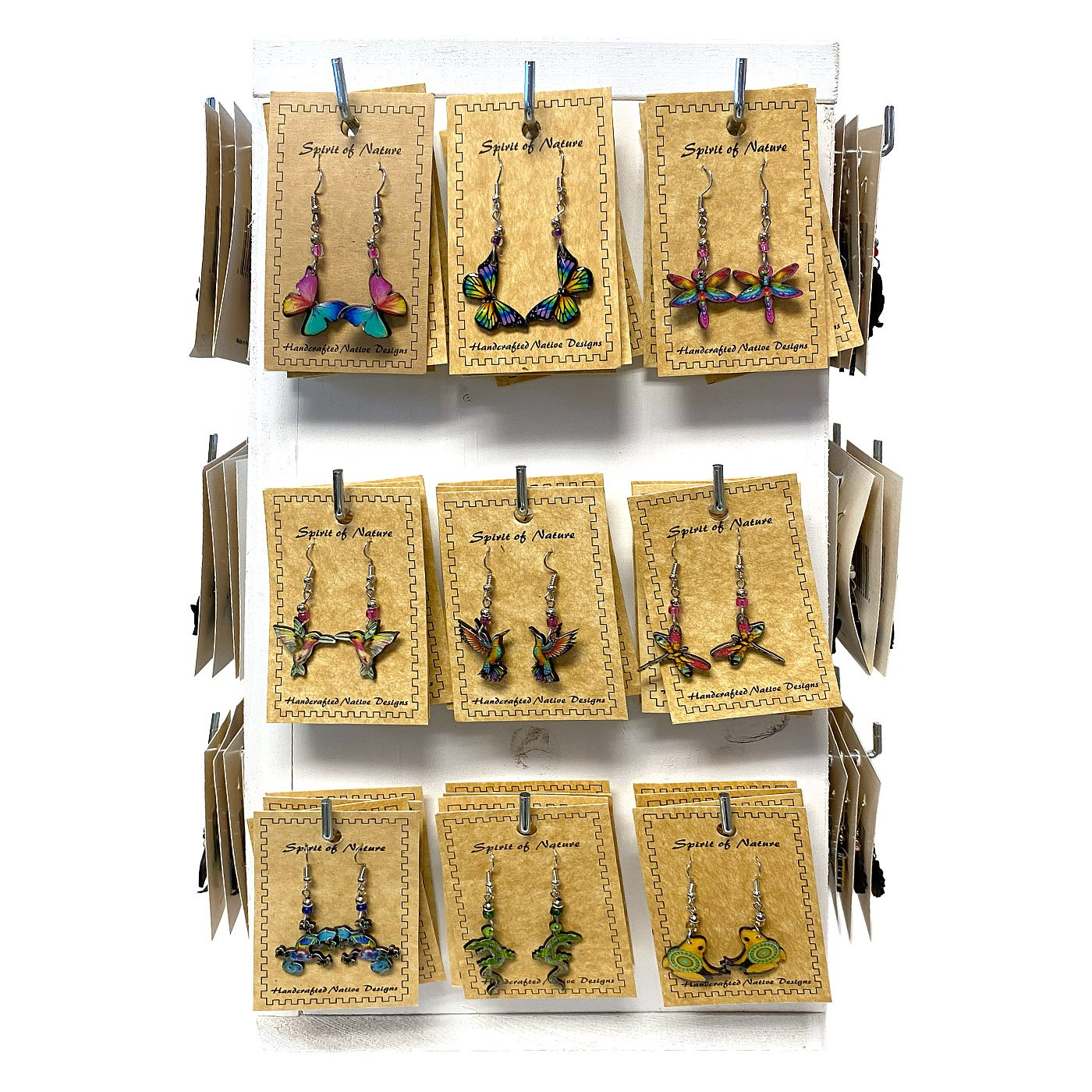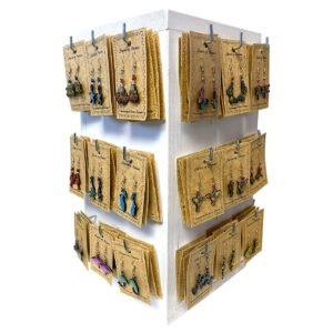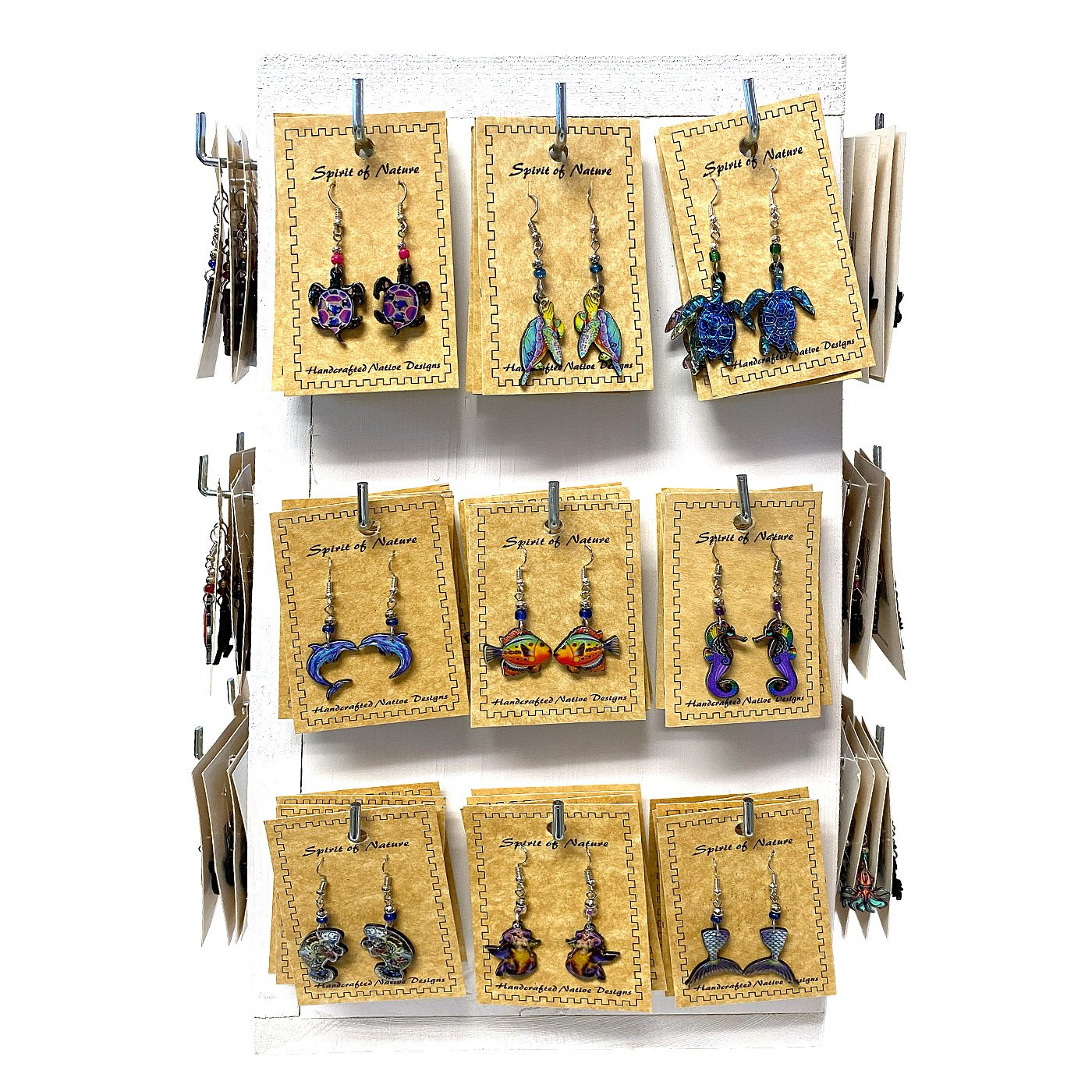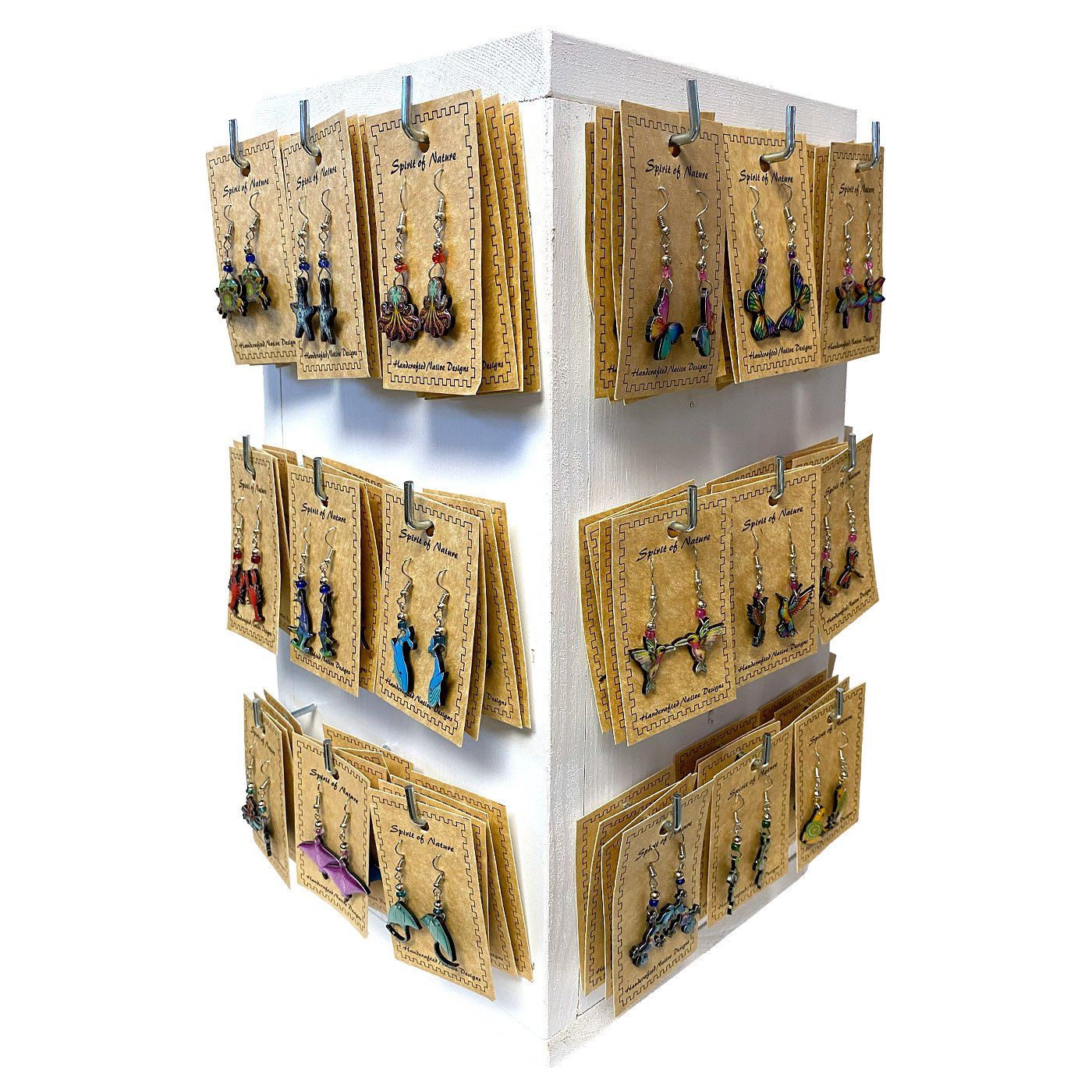 4-sided spinning wooden display for 144 carded tropical animal themed acrylic earrings. Acrylic earrings styles include an assortment of tropical animals.