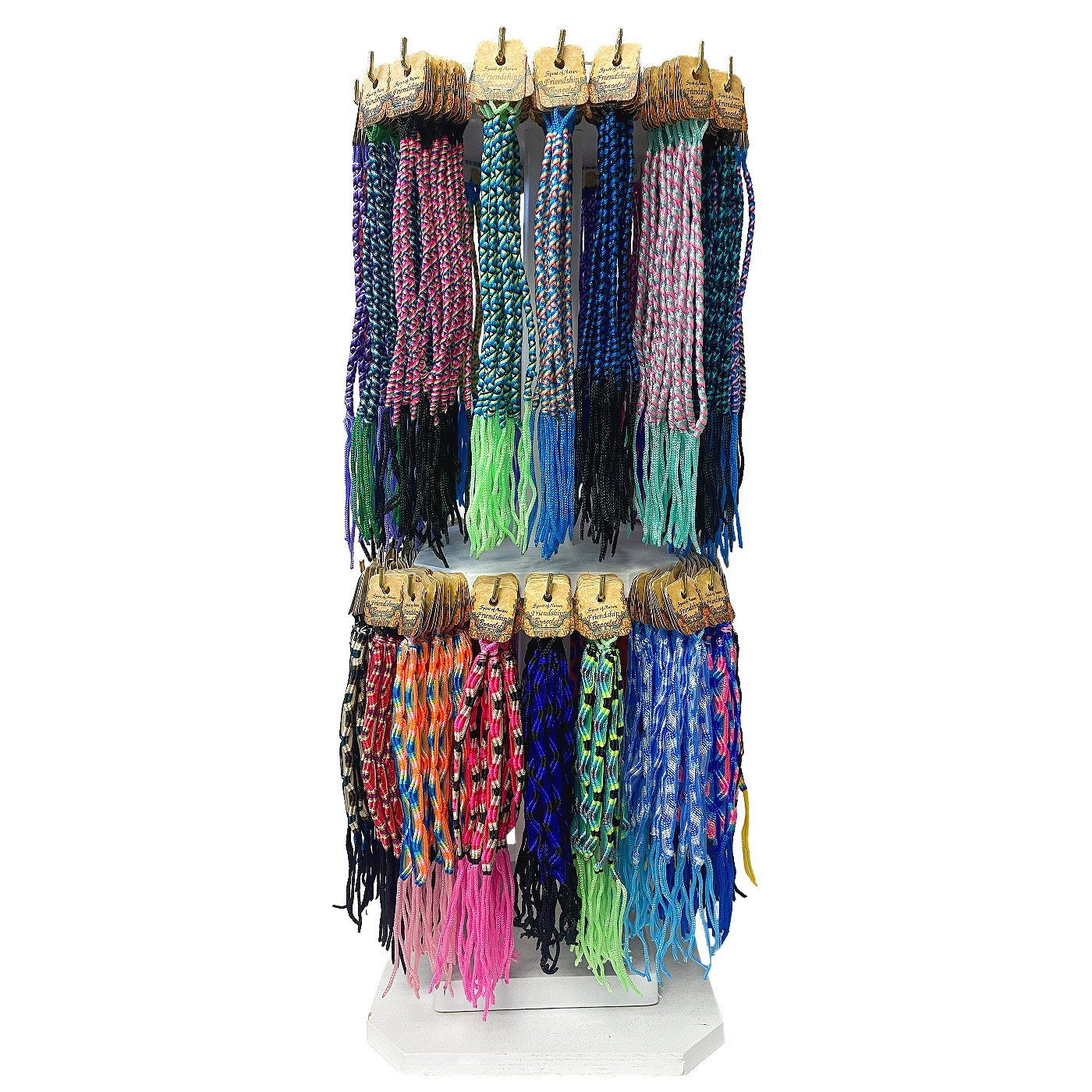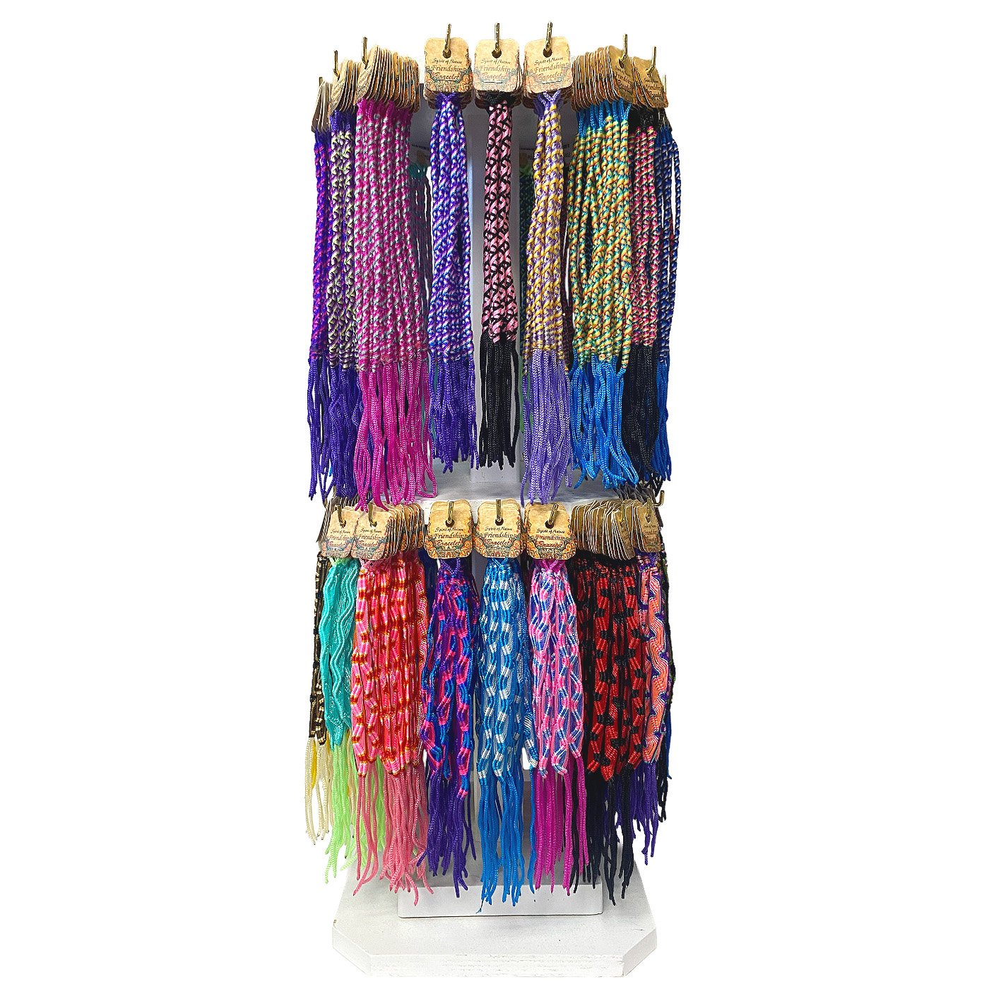 Add a vibrant, high-capacity display to your retail space with this ready-to-sell assortment of carded friendship bracelets. Featuring a colorful mix of braided styles such as POLE and BRM, this 2-tier wooden display is designed to attract attention and maximize retail space.