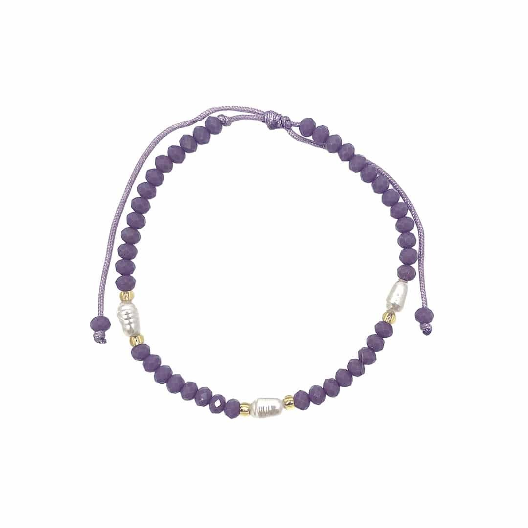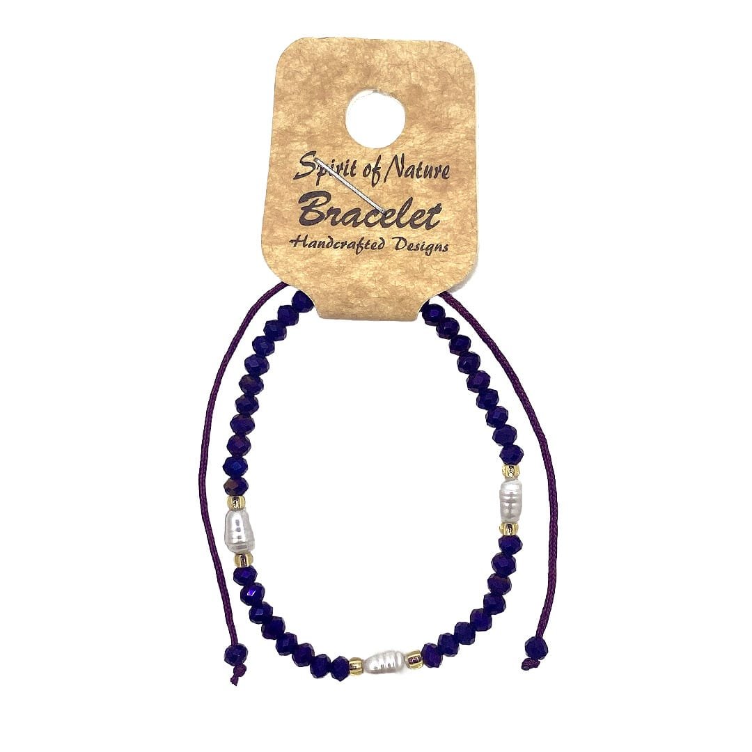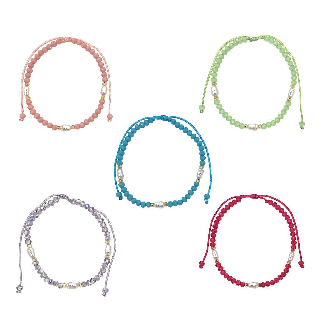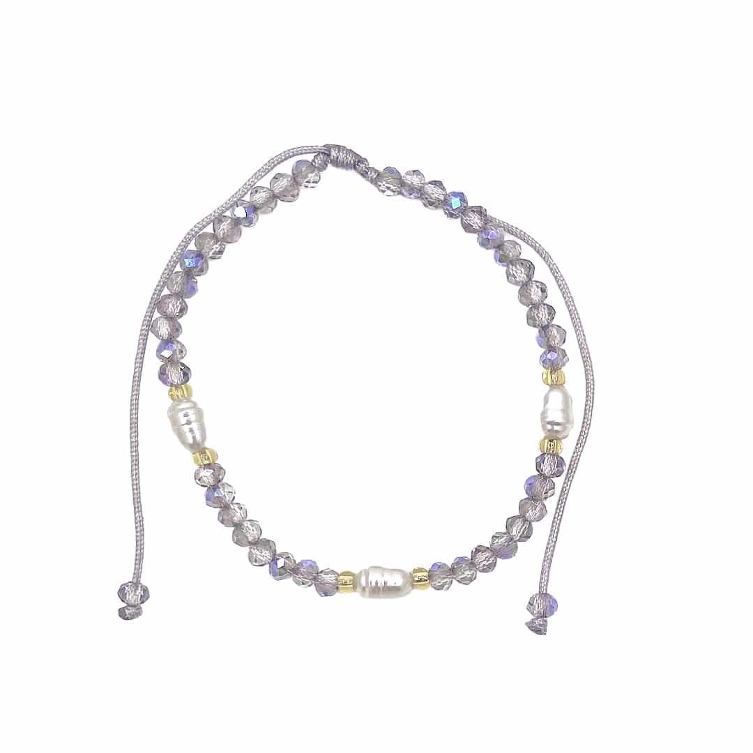 Crystal bead single strand pull tie bracelet with 3 pearl beads. One size fits all with adjustable pull tie strings. Bracelet is lightweight providing a comfortable daily fit.