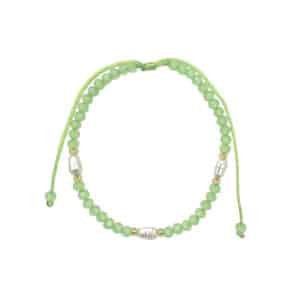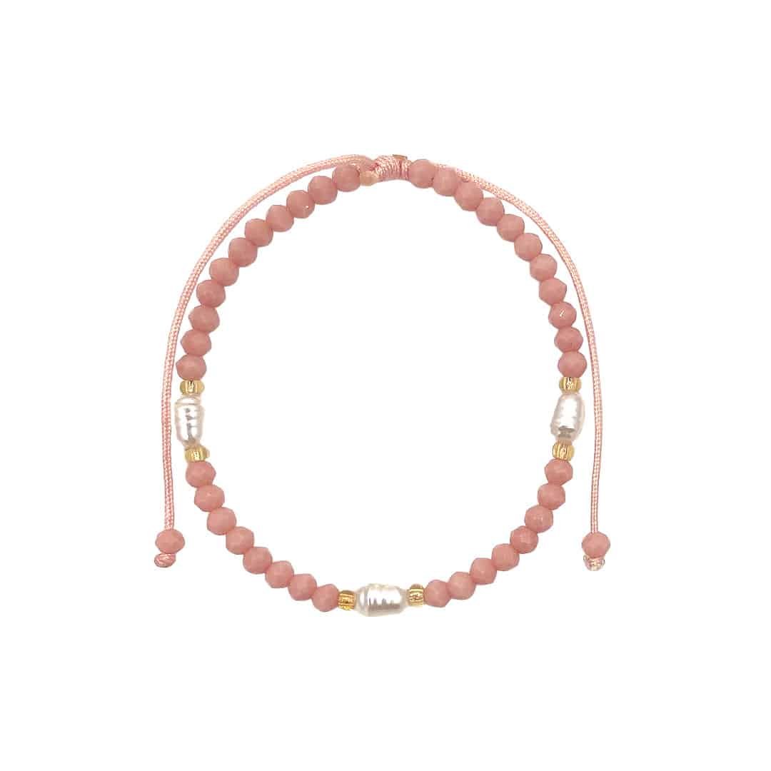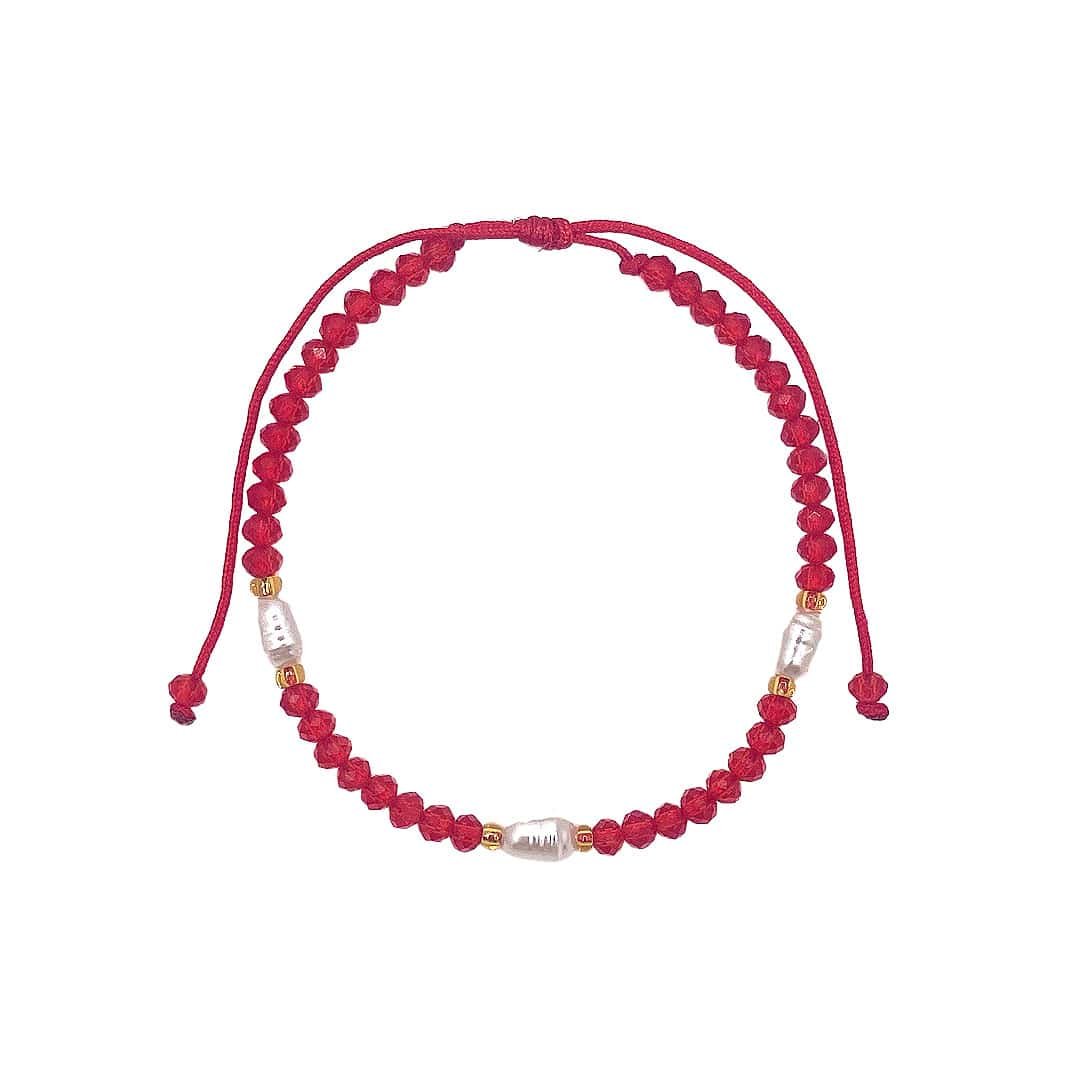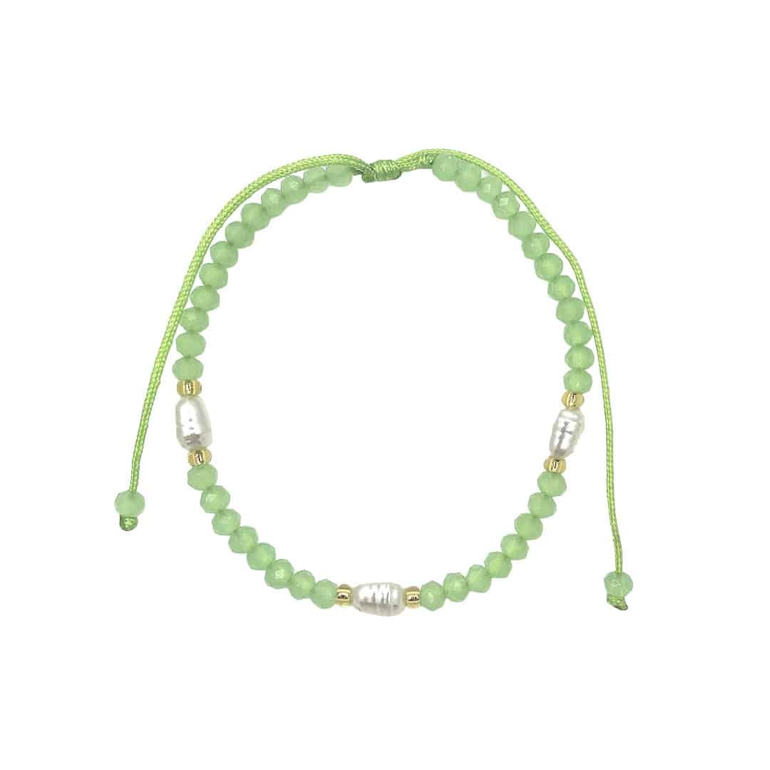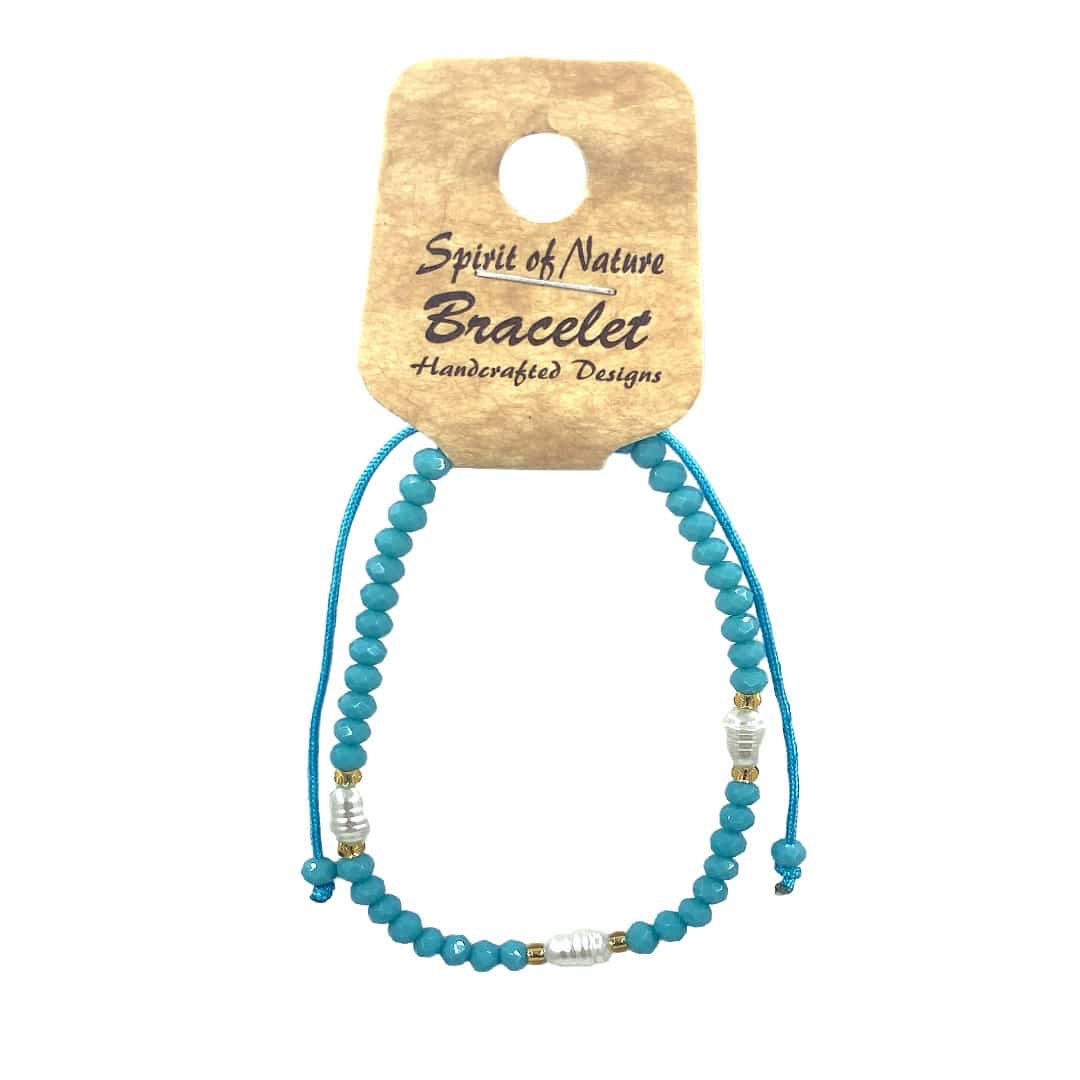 Crystal bead single strand pull tie bracelet with 3 pearl beads. One size fits all with adjustable pull tie strings. Bracelet is lightweight providing a comfortable daily fit.