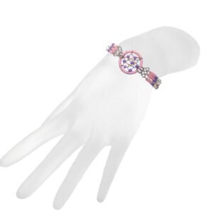 Multicolored seed bead and silver metal chain bracelet with round beaded thread dream catcher centerpiece. Bracelet is adjustable with simple hook clasp and 3 different sizes. Bracelet is lightweight providing a comfortable fit.