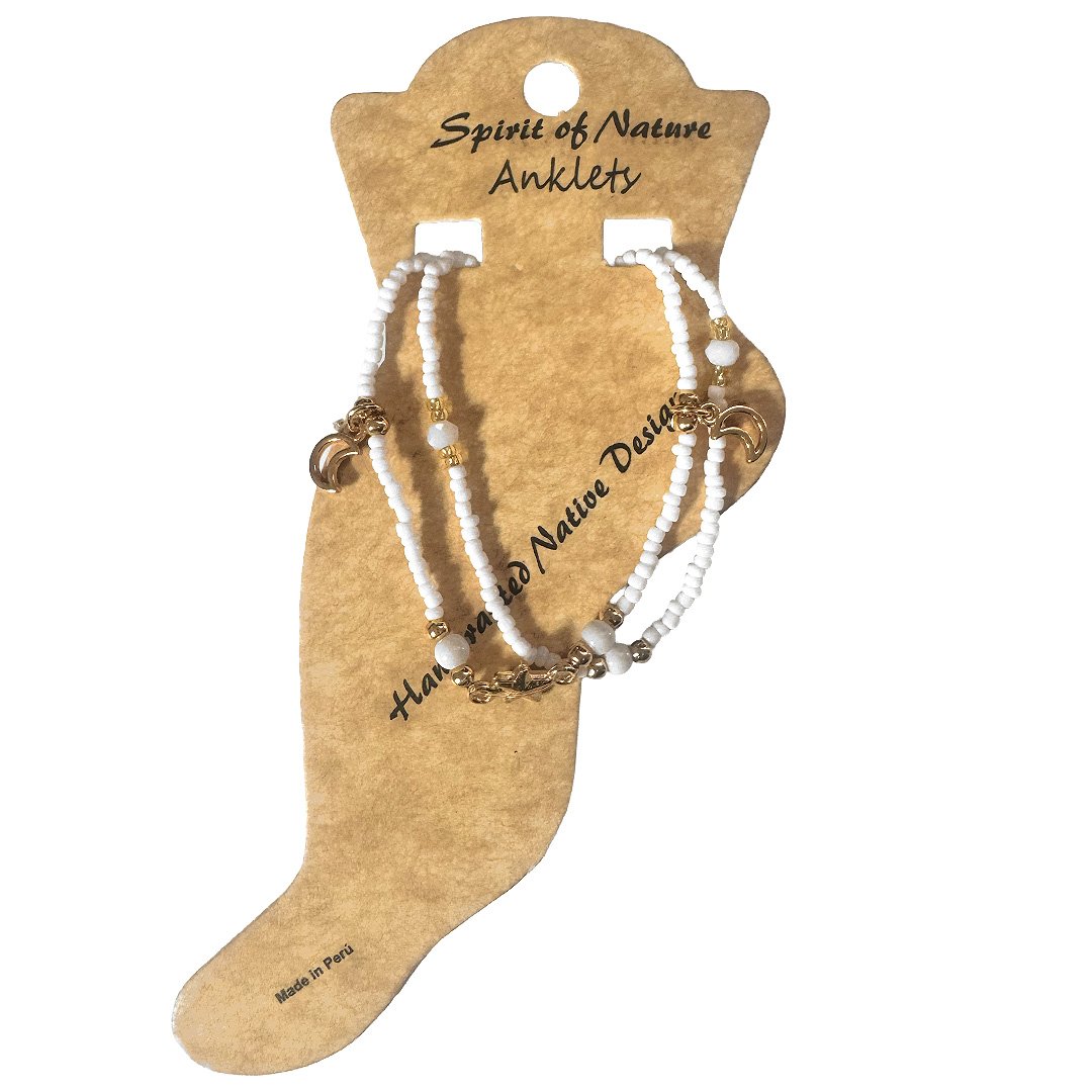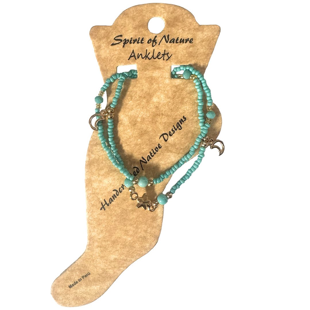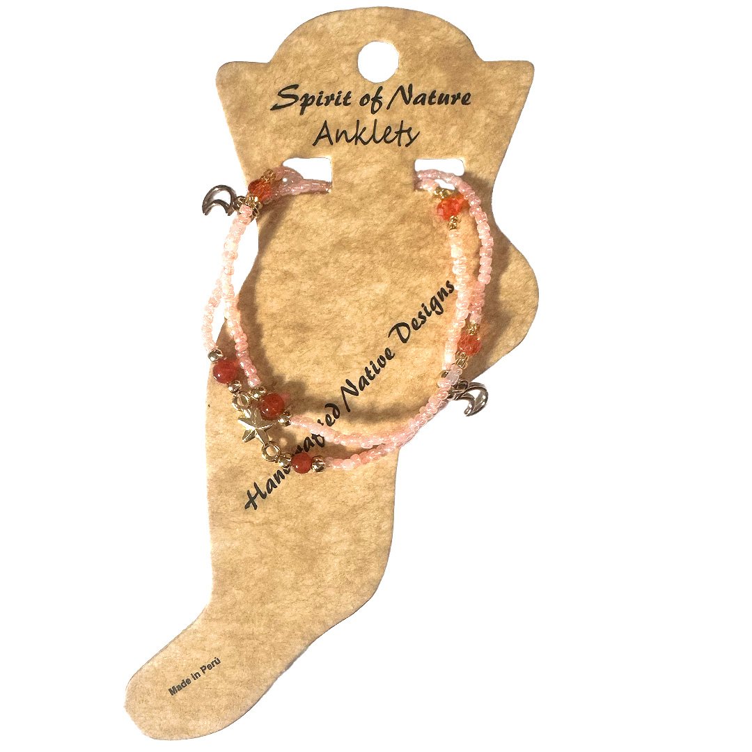 Crystal bead and seed bead multi strand anklet with crescent moon charm dangles and star charm centerpiece. Anklet is adjustable with simple hook clasp and 3 different sizes. Anklet is lightweight providing a comfortable fit.