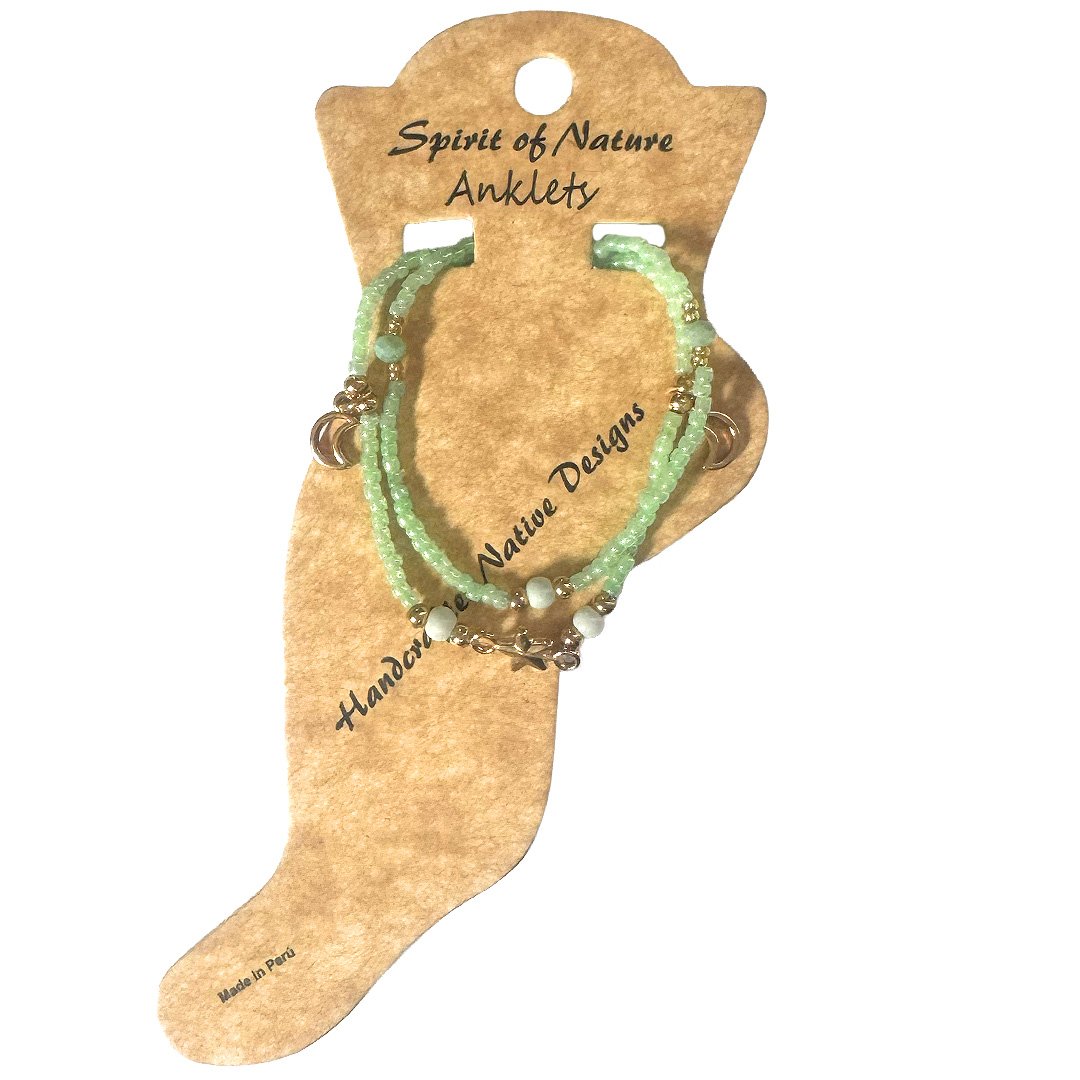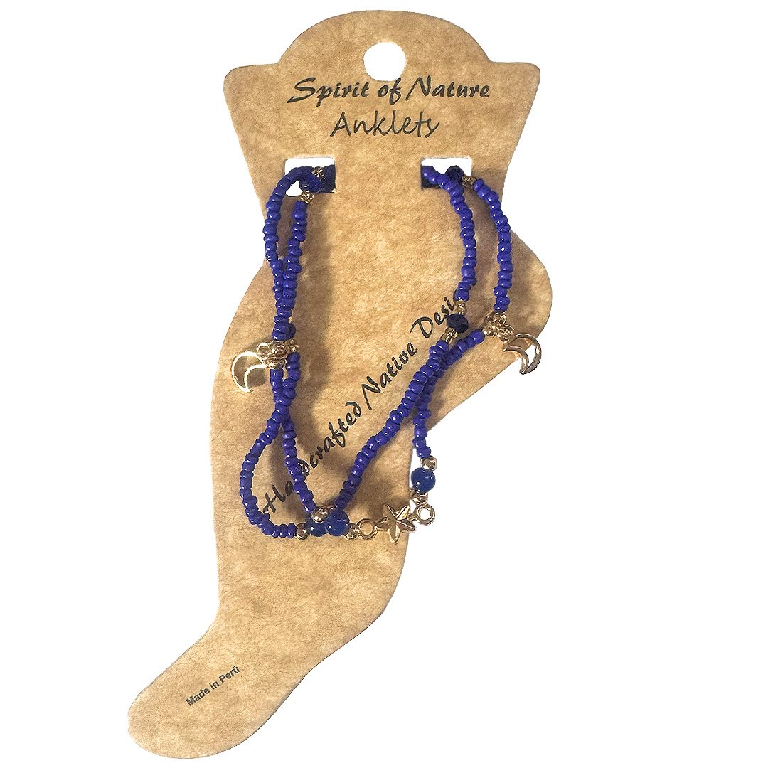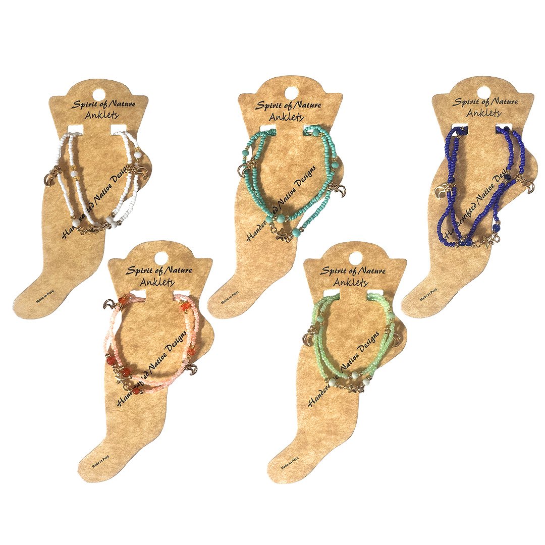 Crystal bead and seed bead multi strand anklet with crescent moon charm dangles and star charm centerpiece. Anklet is adjustable with simple hook clasp and 3 different sizes. Anklet is lightweight providing a comfortable fit.