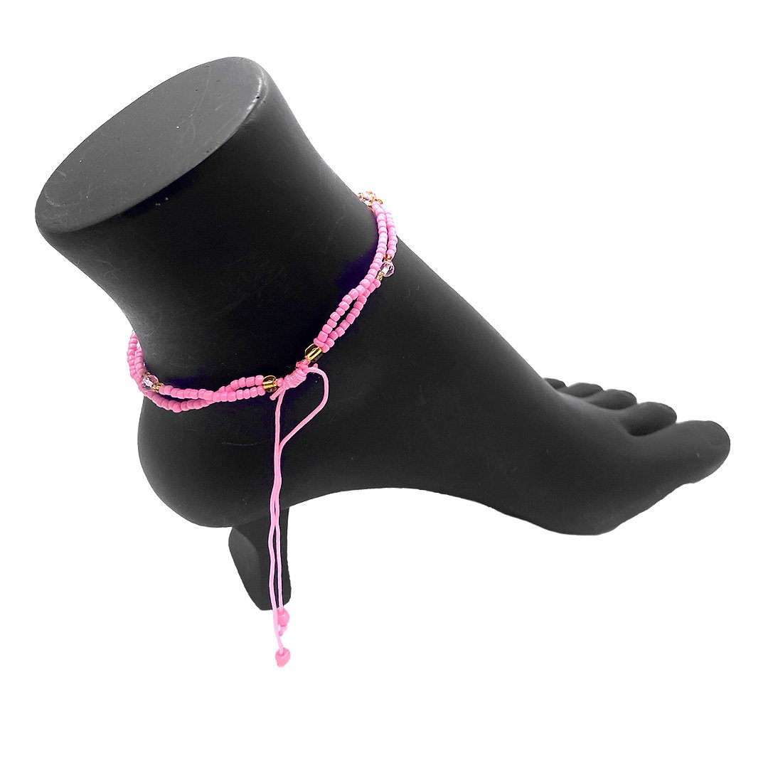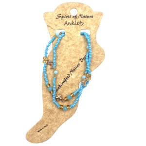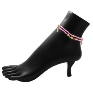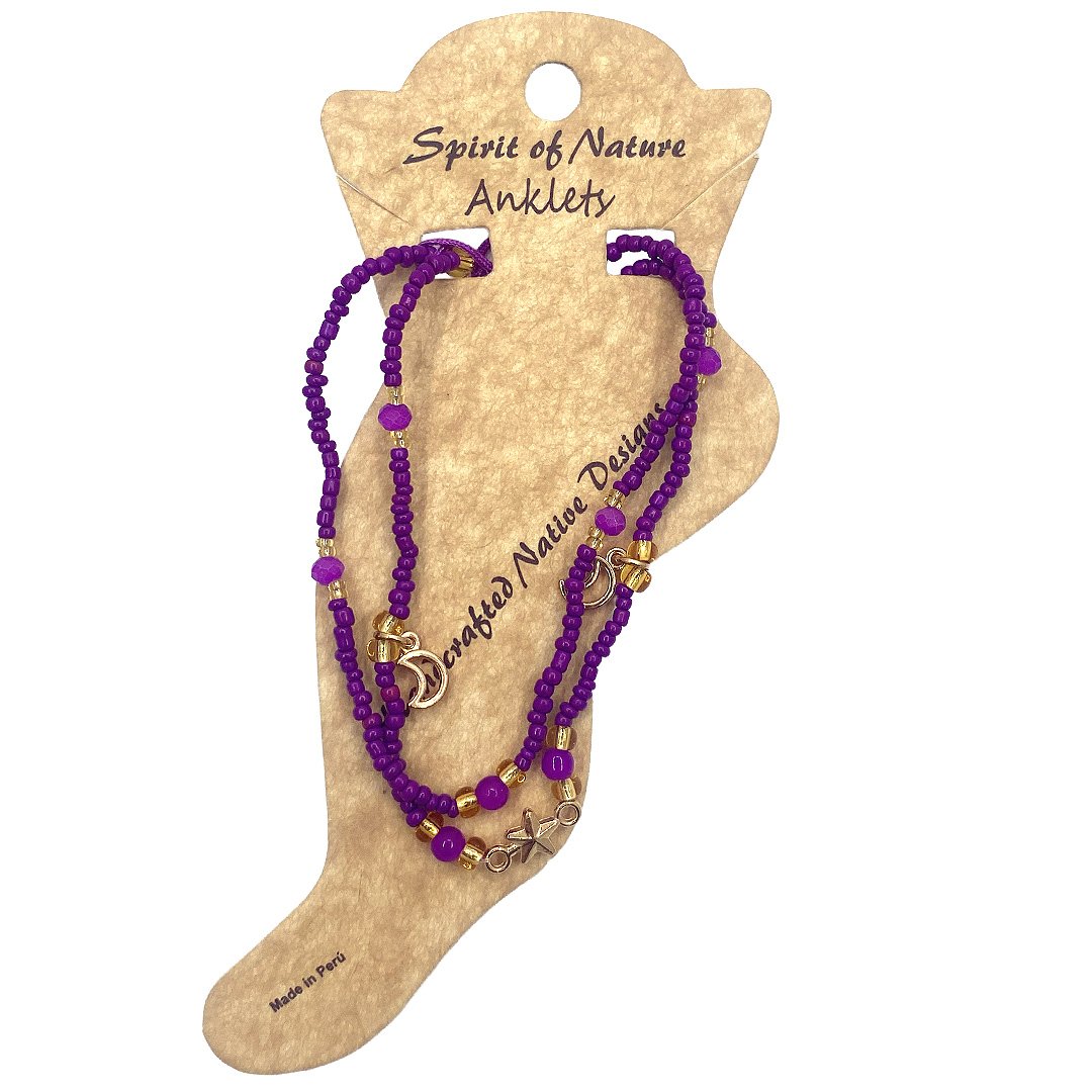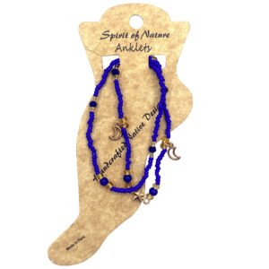 Crystal bead and seed bead multi strand anklet with crescent moon charm dangles and star charm centerpiece. One size fits all with adjustable pull tie strings. Anklet is lightweight providing a comfortable fit.