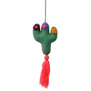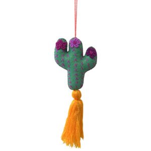 Cactus shaped woven cotton stuffed “backpack doll” hanging ornament with fringe in assorted colors.