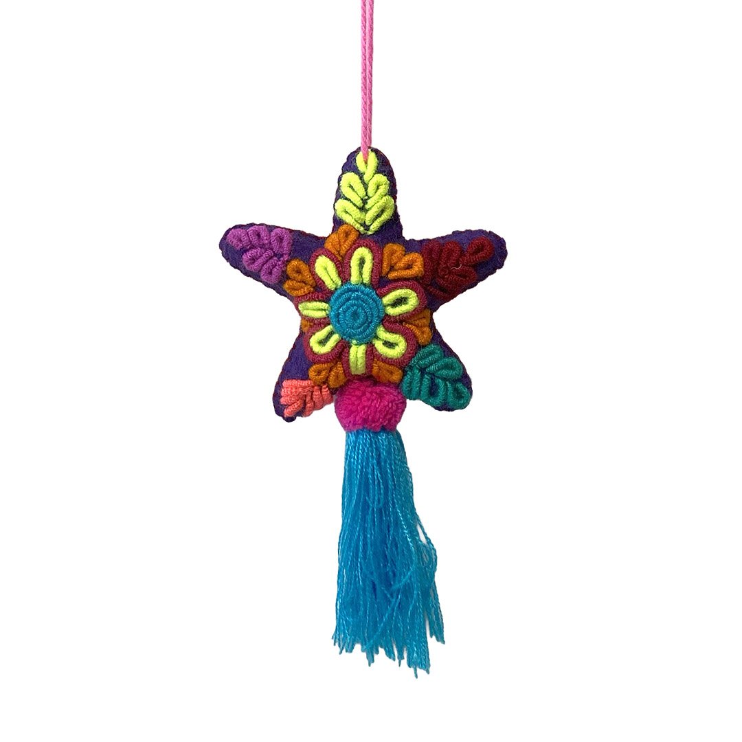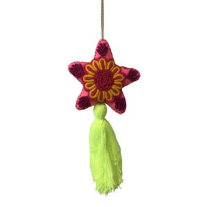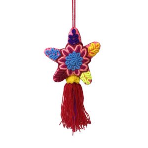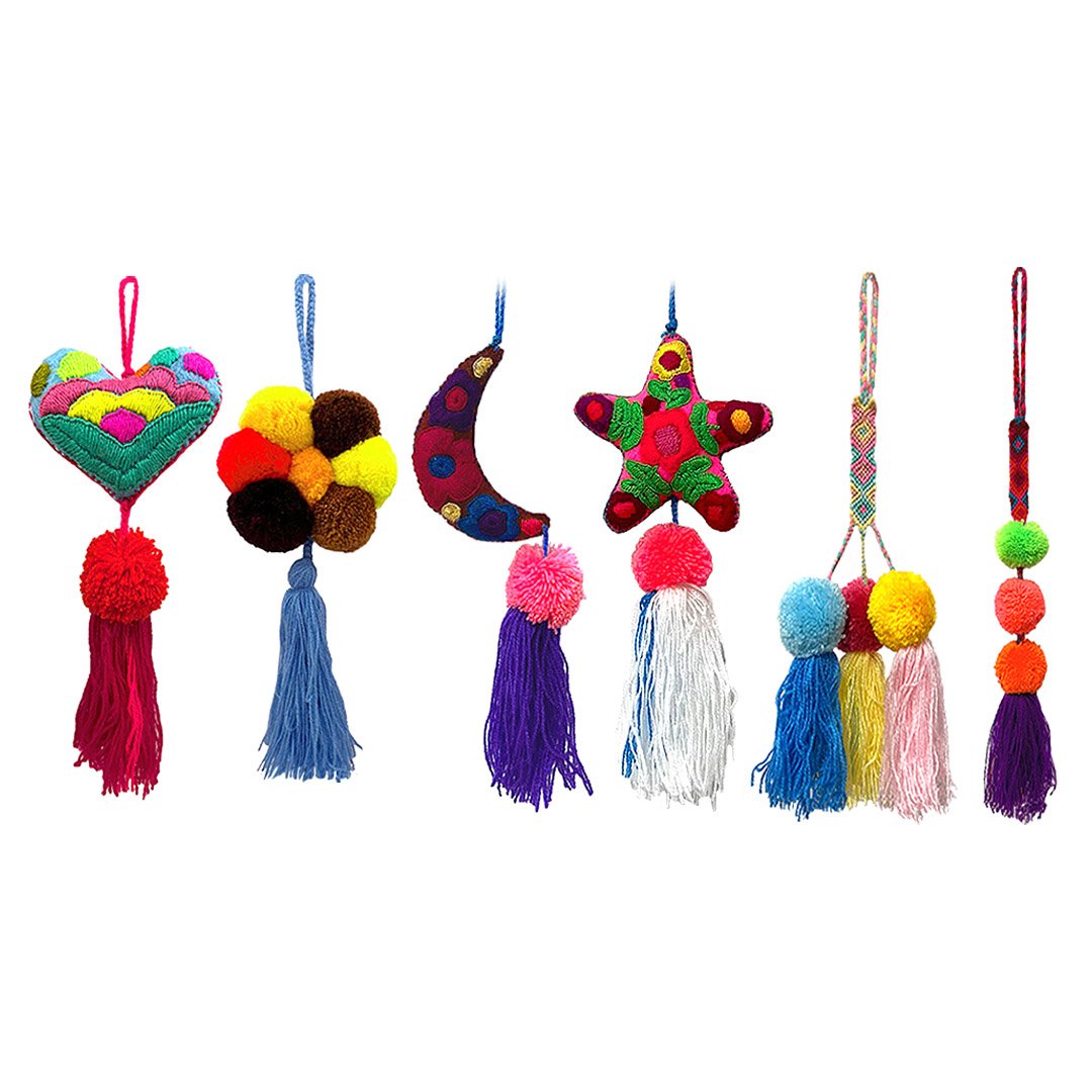 Multicolored woven cotton stuffed “backpack doll” hanging ornament in assorted shapes and styles.