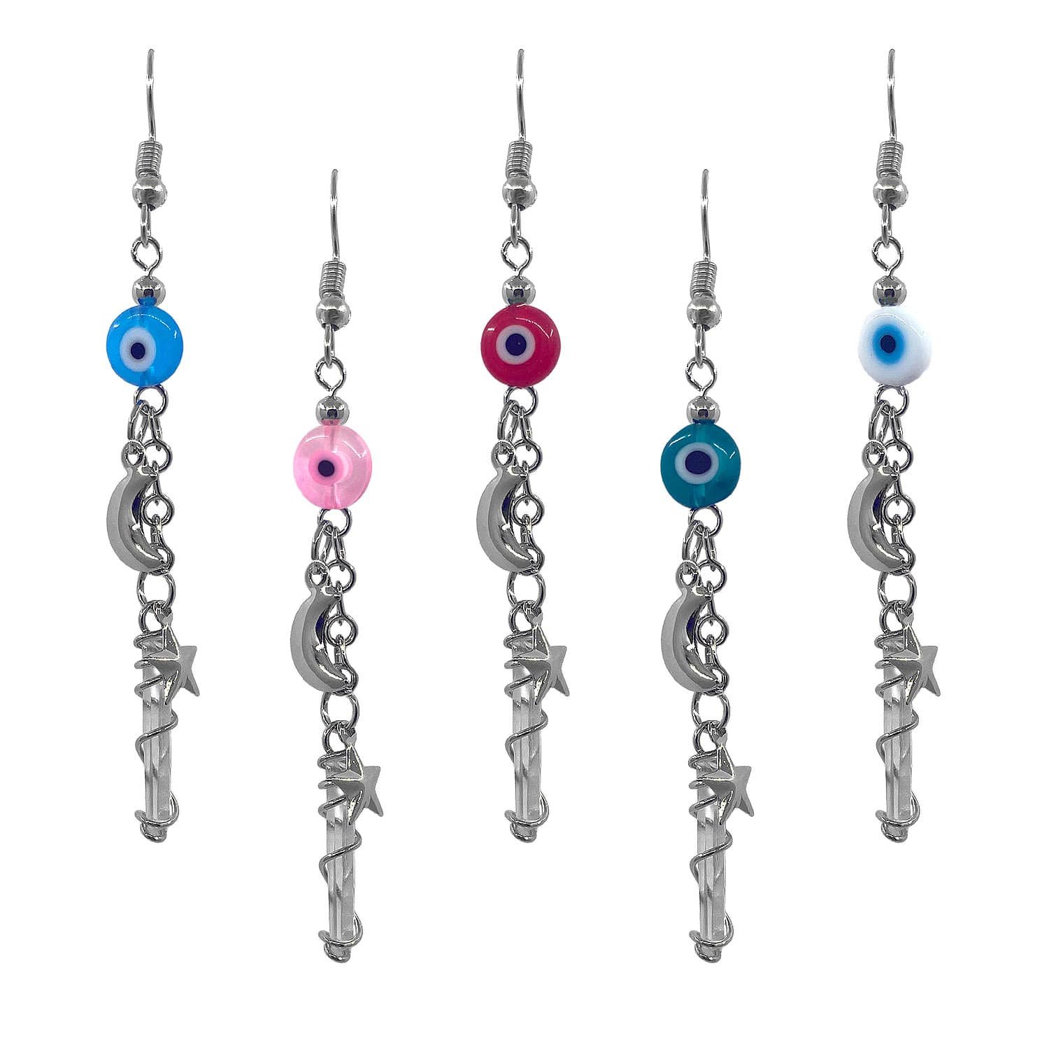 Round evil eye bead earrings with a silver metal wire wrapped clear quartz crystal point and moon and star charm dangle. Sold in assorted colors.