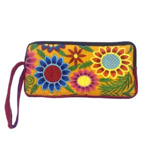 Large rectangle-shaped pouch wristlet bag with multicolored embroidered flower design and wrist strap. Can be carried as a clutch purse/wristlet with wrist strap for support.