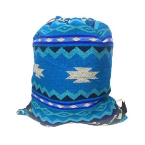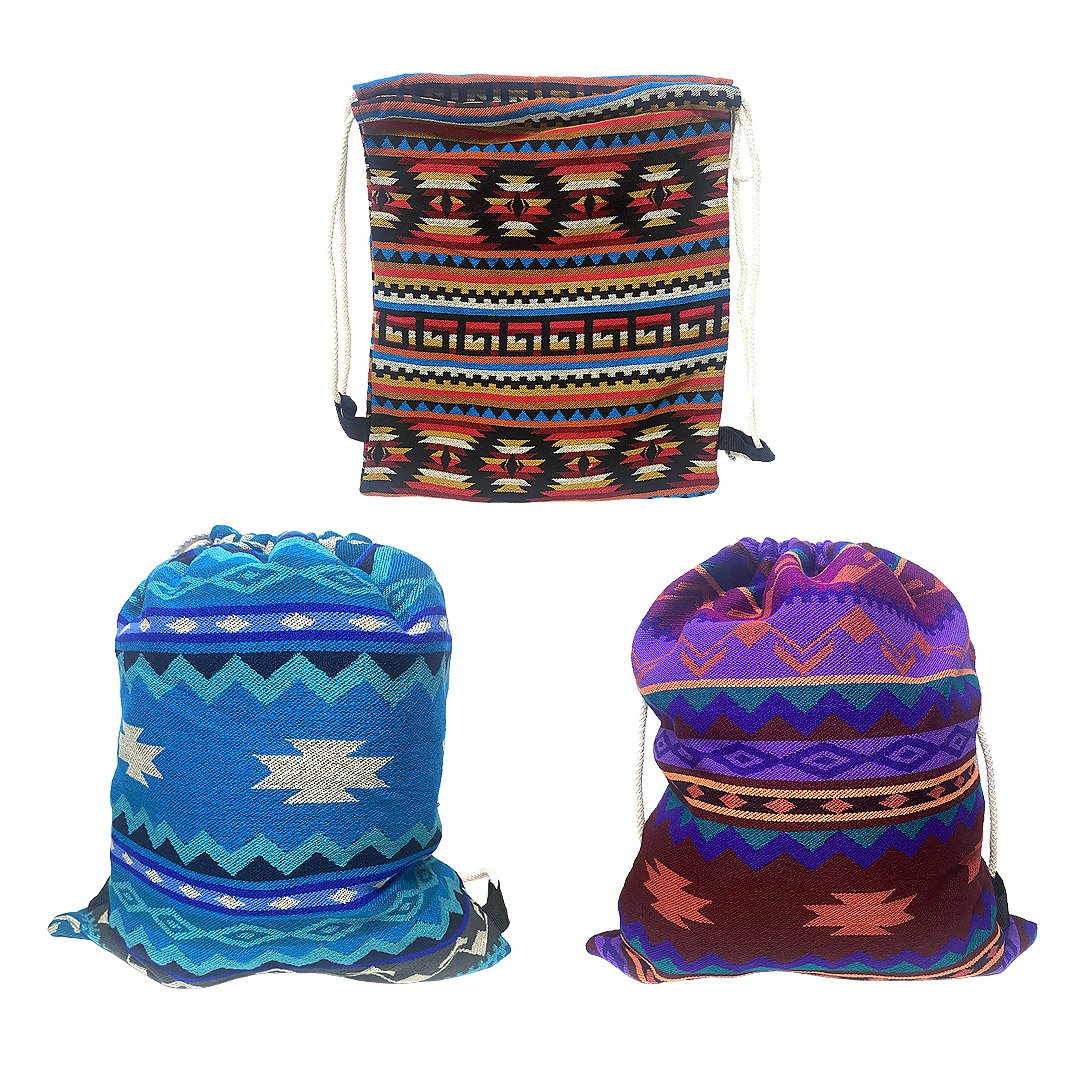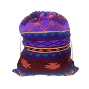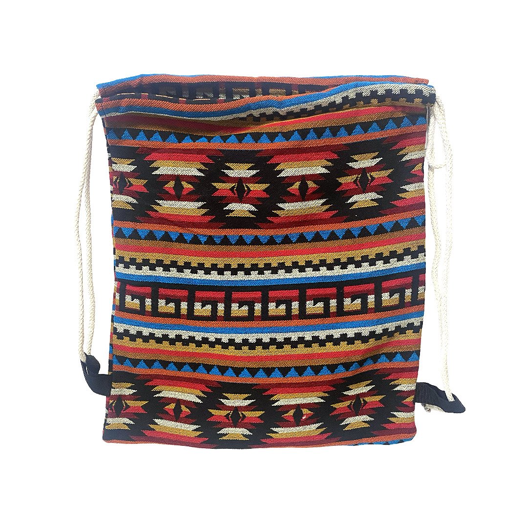 Drawstring backpack with multicolored tribal print striped pattern material.
