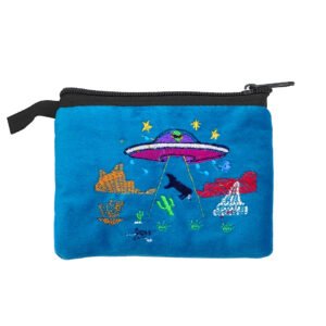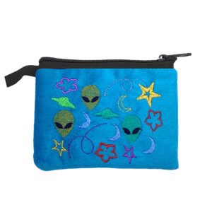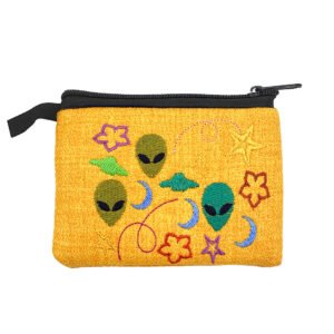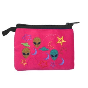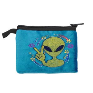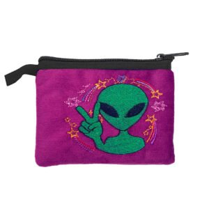 Rectangle-shaped woven coin purse pouch bag with alien design. Bag is slightly cushioned with lightweight padding.