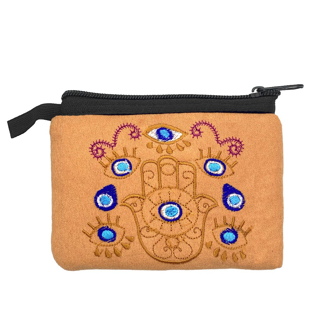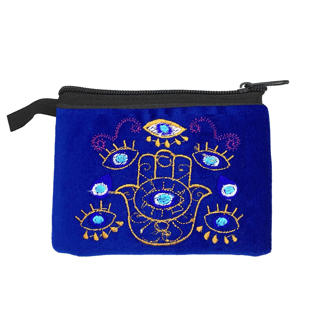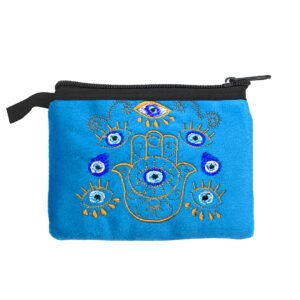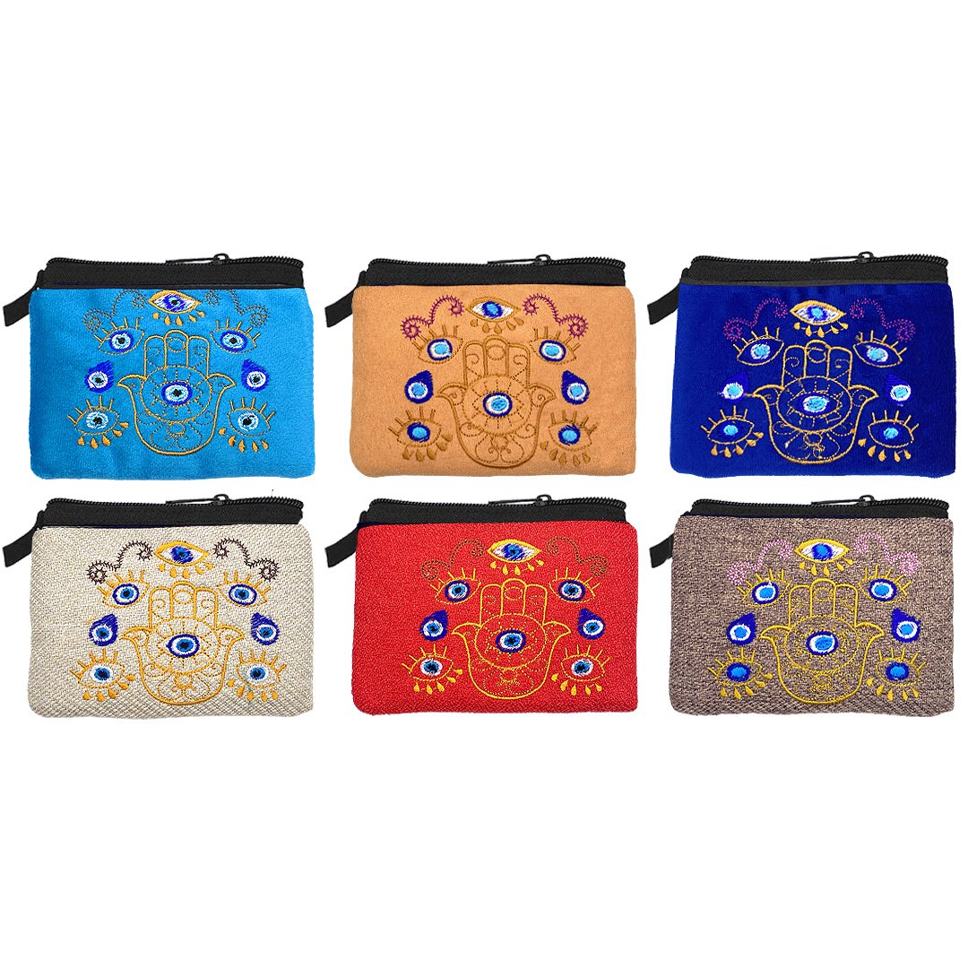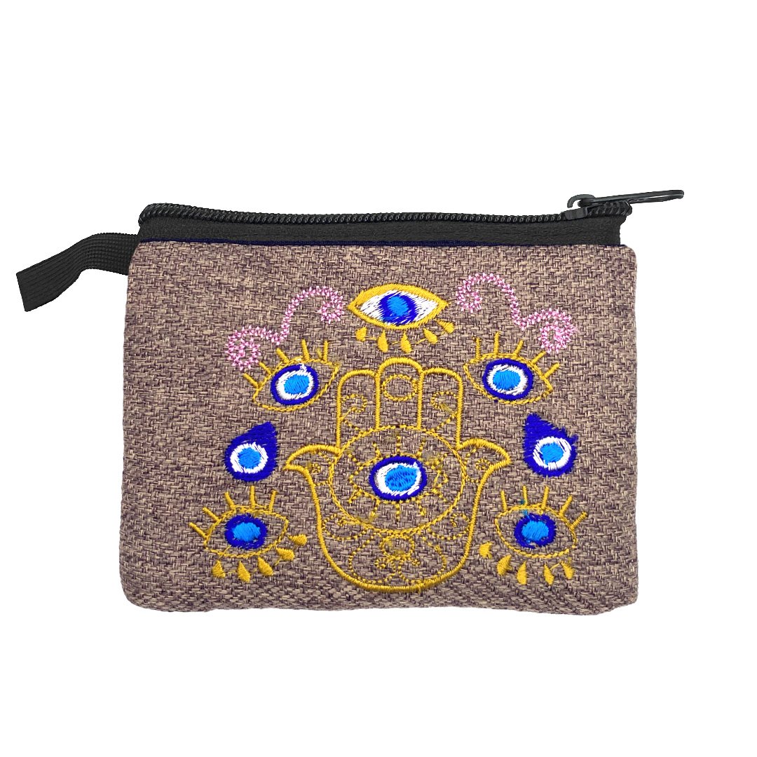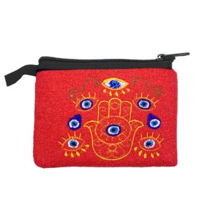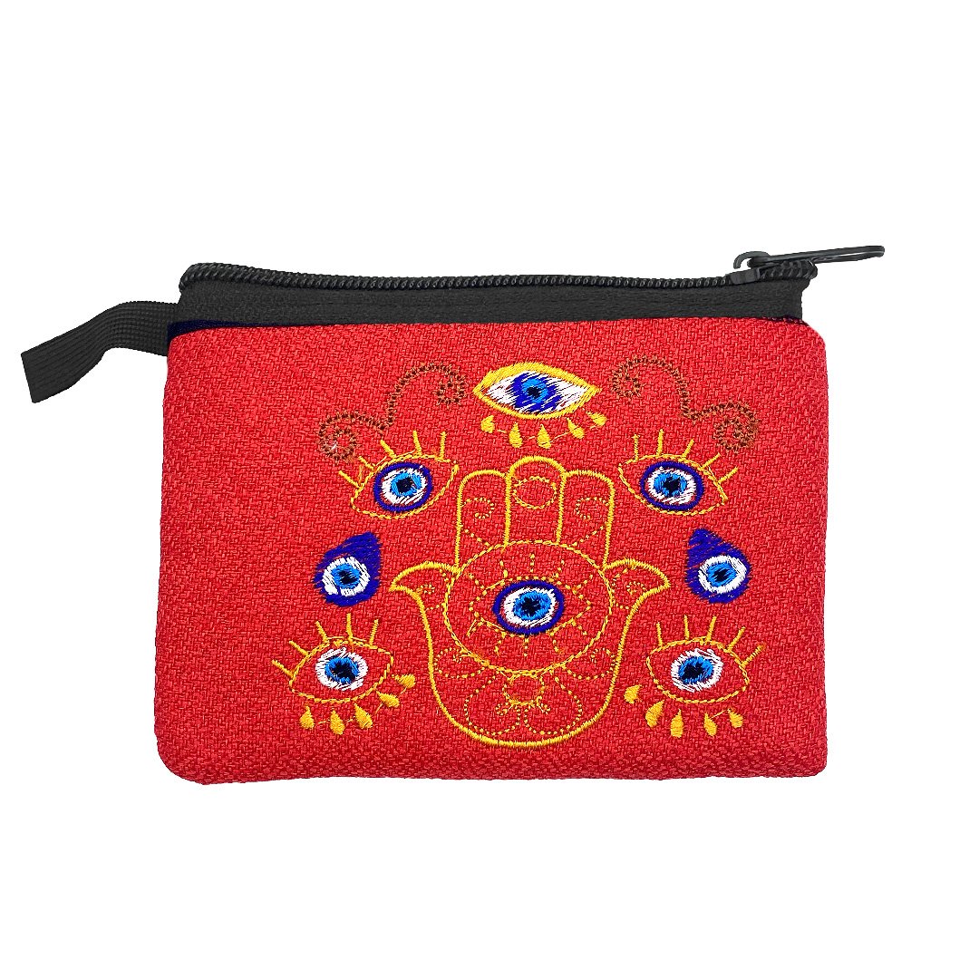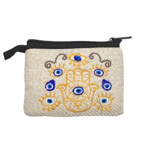 Rectangle shaped woven coin purse pouch bag with hamsa hand and evil eye design. Bag is slightly cushioned with lightweight padding.