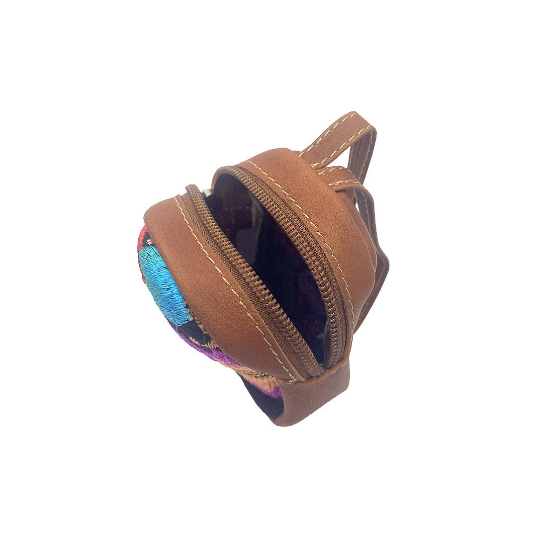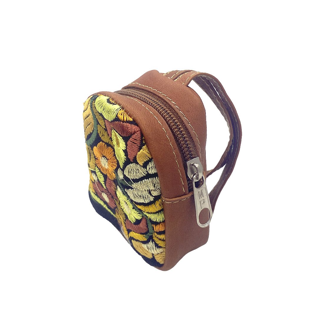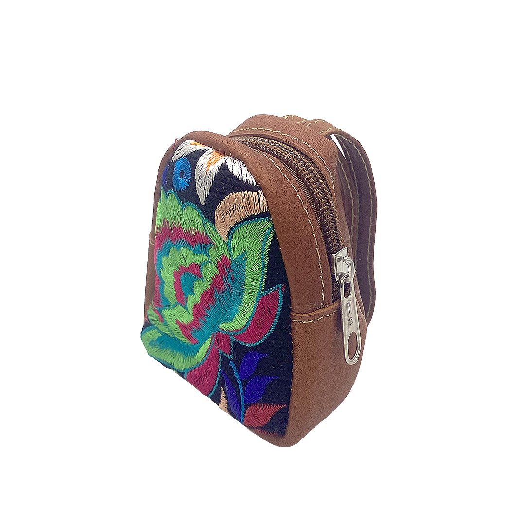 Mini coin purse pouch bag with embroidered floral design and leather strap. Available in assorted styles, such as mini backpacks or mini purses. Bag is slightly cushioned with lightweight padding.