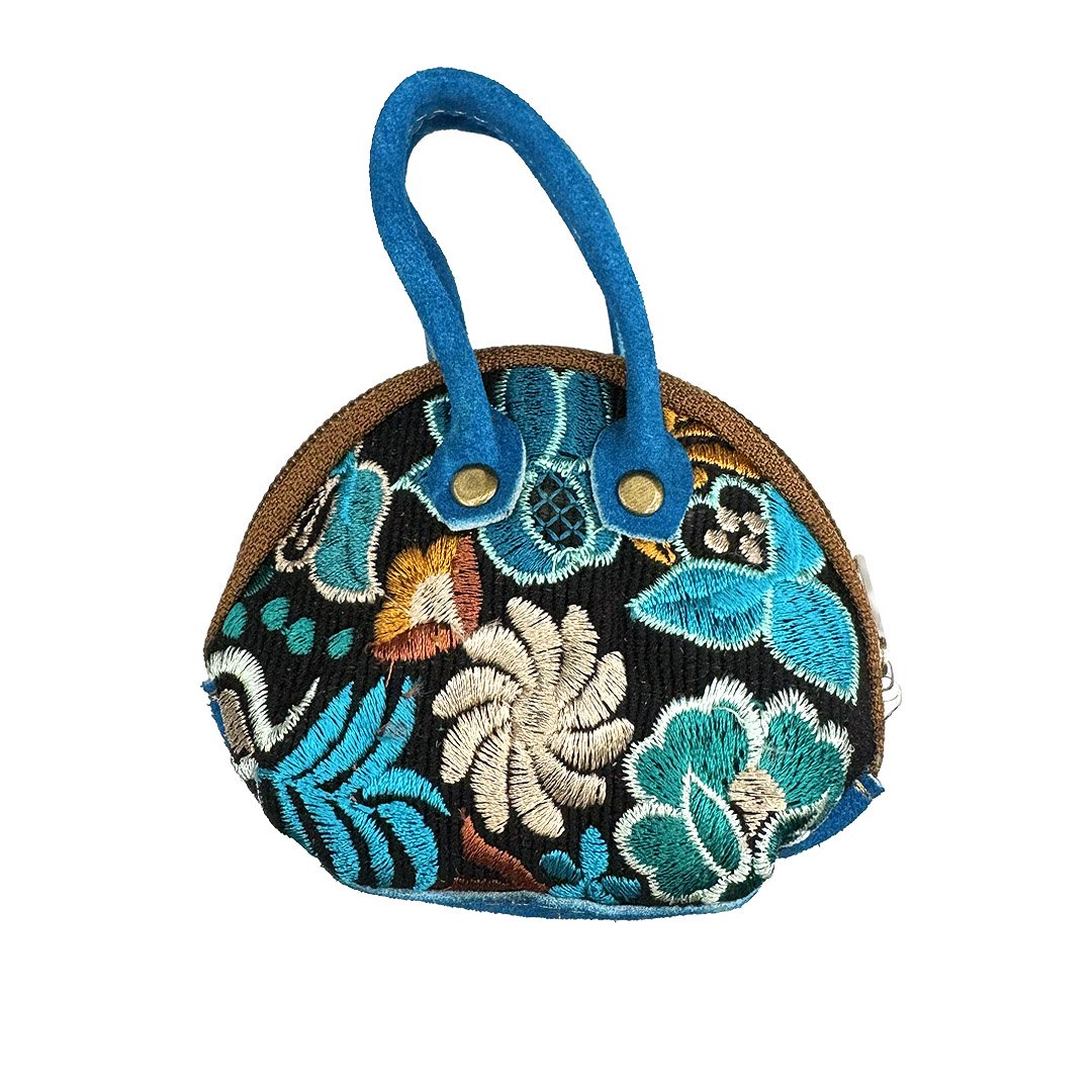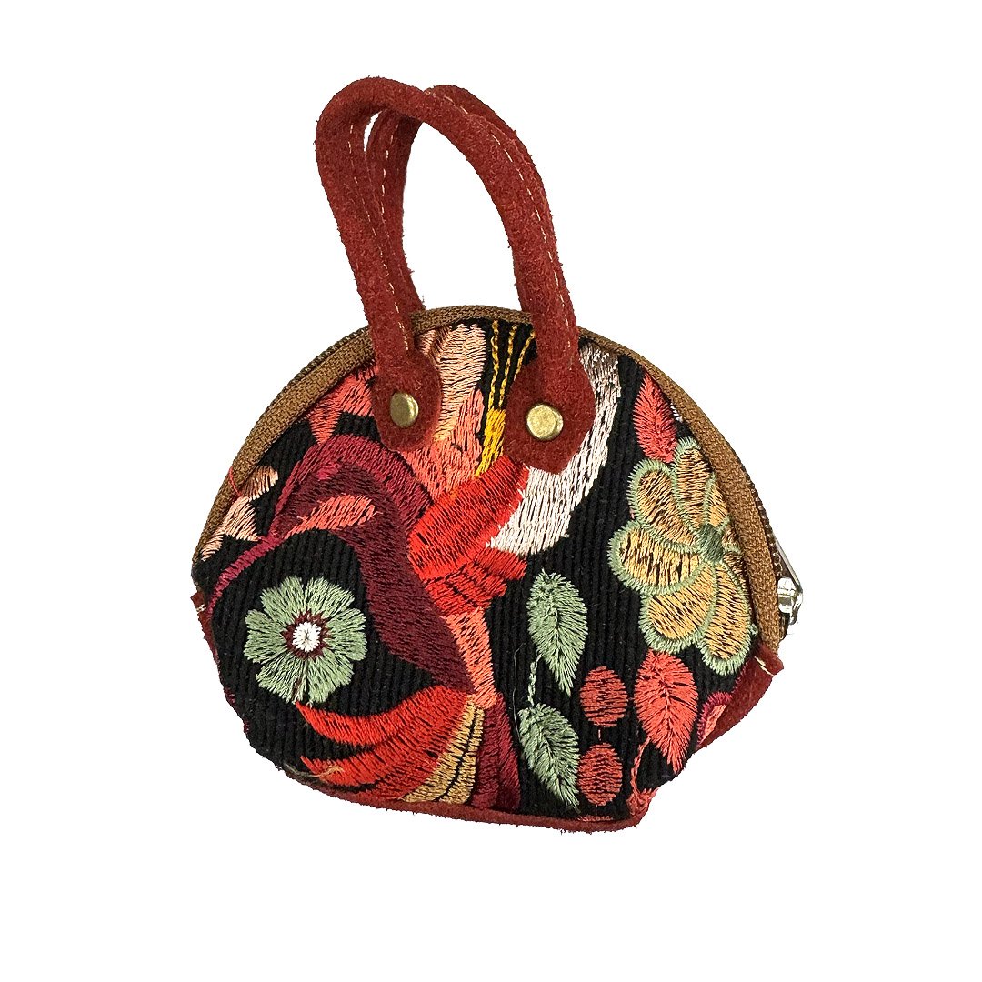 Mini coin purse pouch bag with embroidered floral design and leather strap. Sold in assorted shapes, patterns, and colors.