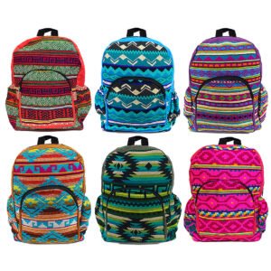 Large backpack with multicolored tribal print striped pattern material and vegan suede. Backpack is slightly cushioned with lightweight padding. Black buckle shoulder straps are adjustable for a comfortable fit.