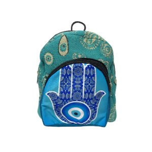 Mini backpack with multicolored hamsa hand graphic art design, blue evil eye themed print pattern material, and vegan suede. Backpack is slightly cushioned with lightweight padding. Black buckle shoulder straps are adjustable for a comfortable fit.