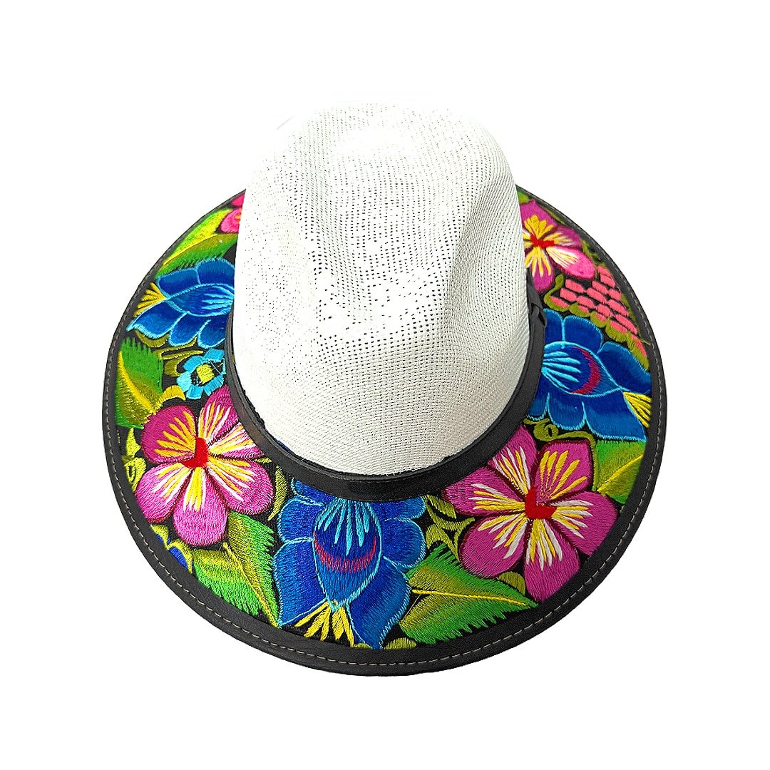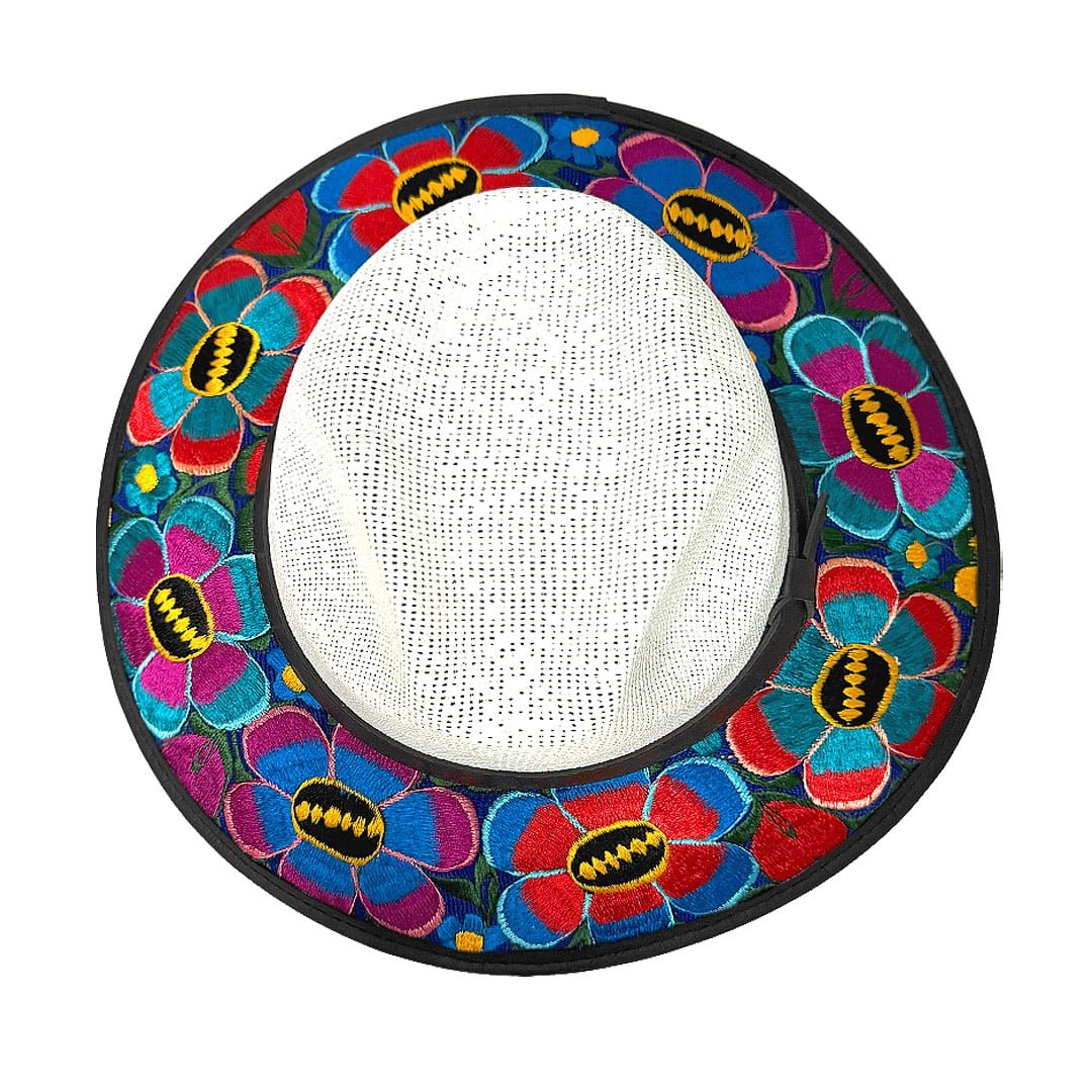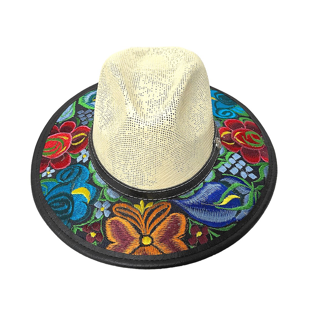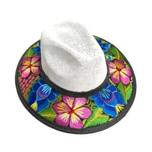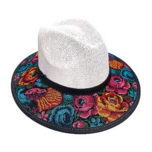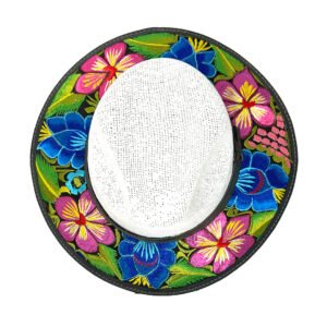 Straw hat for adults with multicolored floral embroidered rim. Standard adult’s one size fits all. Typically worn as a “sun hat” or “sombrero”.