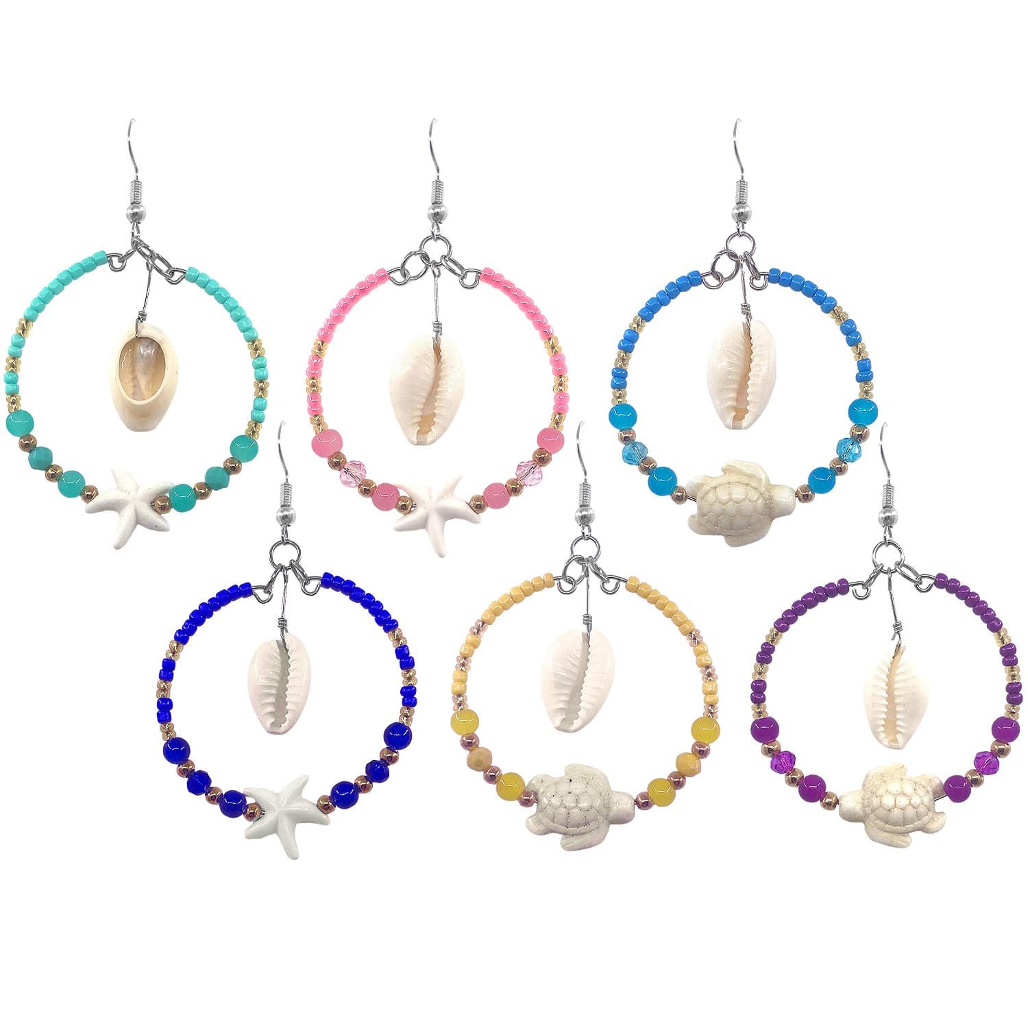 Round seed bead, crystal bead, and sea life themed bead metal hoop earrings with natural sea shell dangle. Available in assorted styles such as natural sea shell, sea turtle stone or starfish stone. Surgical steel hooks are hypoallergenic and lightweight for a comfortable fit.