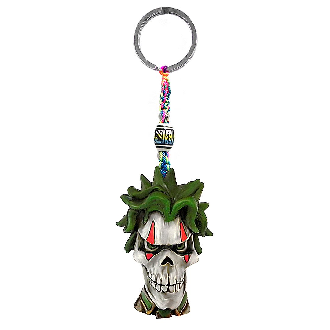 Handcrafted durepox resin figurine keychain of an evil clown skull with green hair and tie. Braided macramé, large bead, and metal keyring attached. Link keychain to your keys, wallet, backpack, or purse!