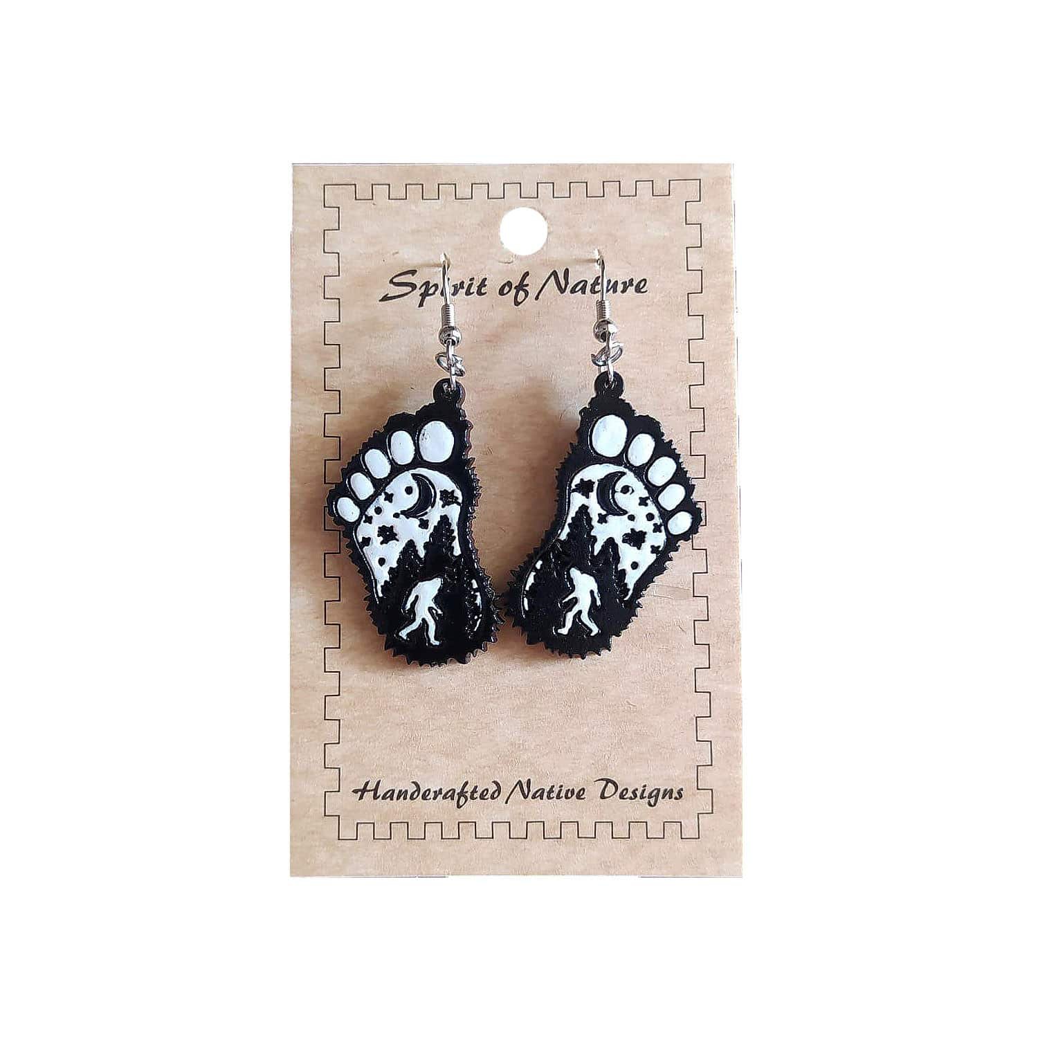 Large wooden hand-carved dangle earrings with assorted bigfoot designs on hooks. Surgical steel hooks are hypoallergenic and lightweight for a comfortable fit.