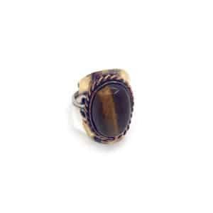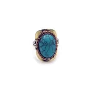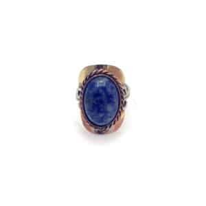 Alpaca silver and copper metal ring with “semi-precious” stone cabochon in assorted shapes and styles. Ring is adjustable with flexible metal band. Ring is lightweight providing a comfortable fit.