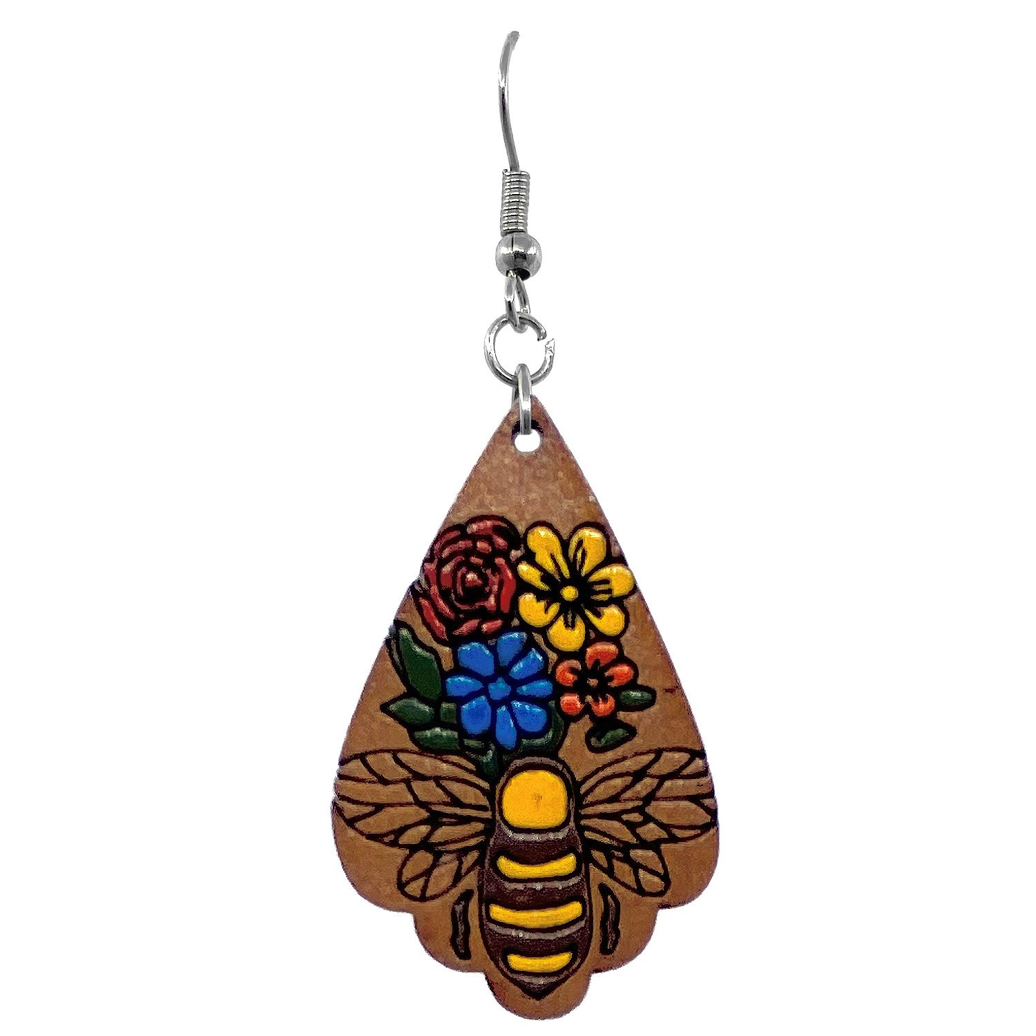 Large wooden hand-carved dangle earrings with assorted bee and flower designs on hooks. Surgical steel hooks are hypoallergenic and lightweight for a comfortable fit.